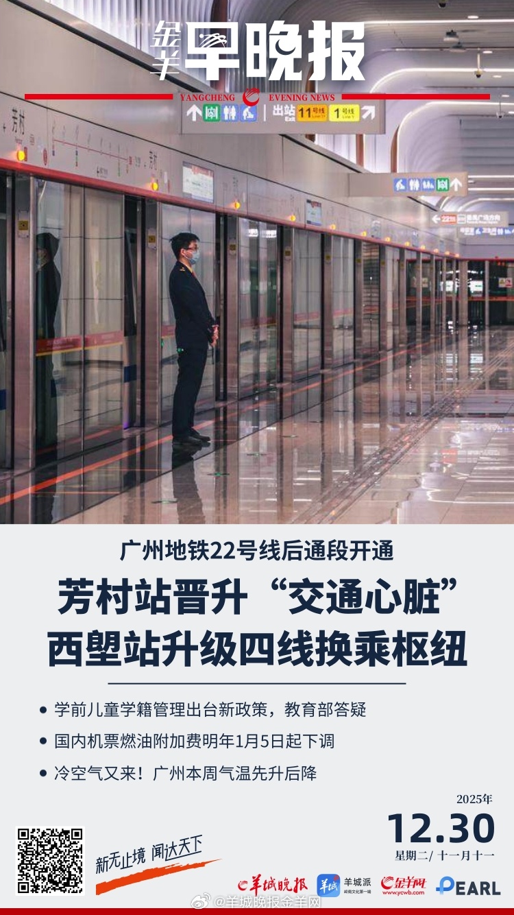 #金羊早晚报# 广州地铁22号线后通段开通,如何撬动荔湾芳村片区交通网络? 冷空气又来!广州本周气温先升后降,元旦出游注意雨雪天气 2026年1月1日起,我国调整部分商品关税税率税目 学前儿童学籍管理出台新政策,教育部答疑 “被打还手即互殴”将成为历史,新治安管理处罚法明年1月1日执行 数字人民币将迎来重大调整,明年起钱包余额可计息 第44届省港杯开赛,9人广东队首回合2比2战平中国香港队 林俊杰和女友相差近20岁 曾回应女友年龄标准 韩国检方对尹锡悦、金建希等76人提起诉讼 拉夫罗夫:俄方反对任何形式“台独”丨鸣“漫”天下 特泽会晤闭门三小时谈成了啥? 中柬泰外长会晤成功举行并发表新闻公报 莫斯科遭到大规模轰炸,空中交通陷入瘫痪 国际黄金、白银期价大幅下跌 更多精彩报道,请扫码关注羊晚全媒体报道!#莫斯科遭袭空中交通瘫痪##特朗普称得知普京官邸遭袭很生气##黄金白银或现更严重下跌##林俊杰官宣恋情##林俊杰方否认女友怀孕#