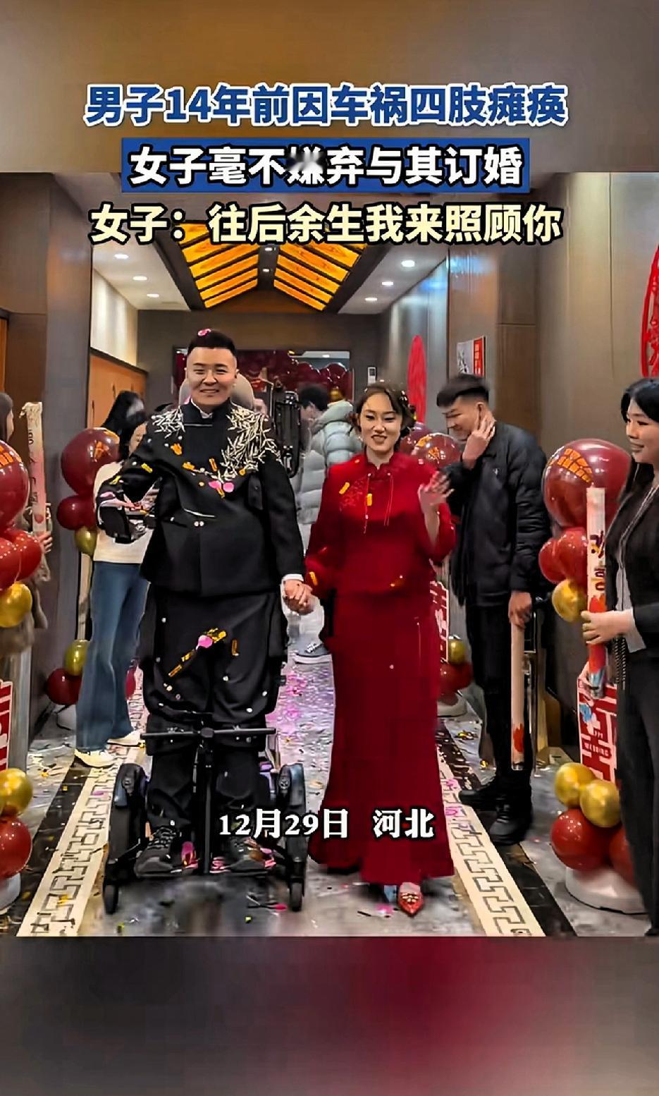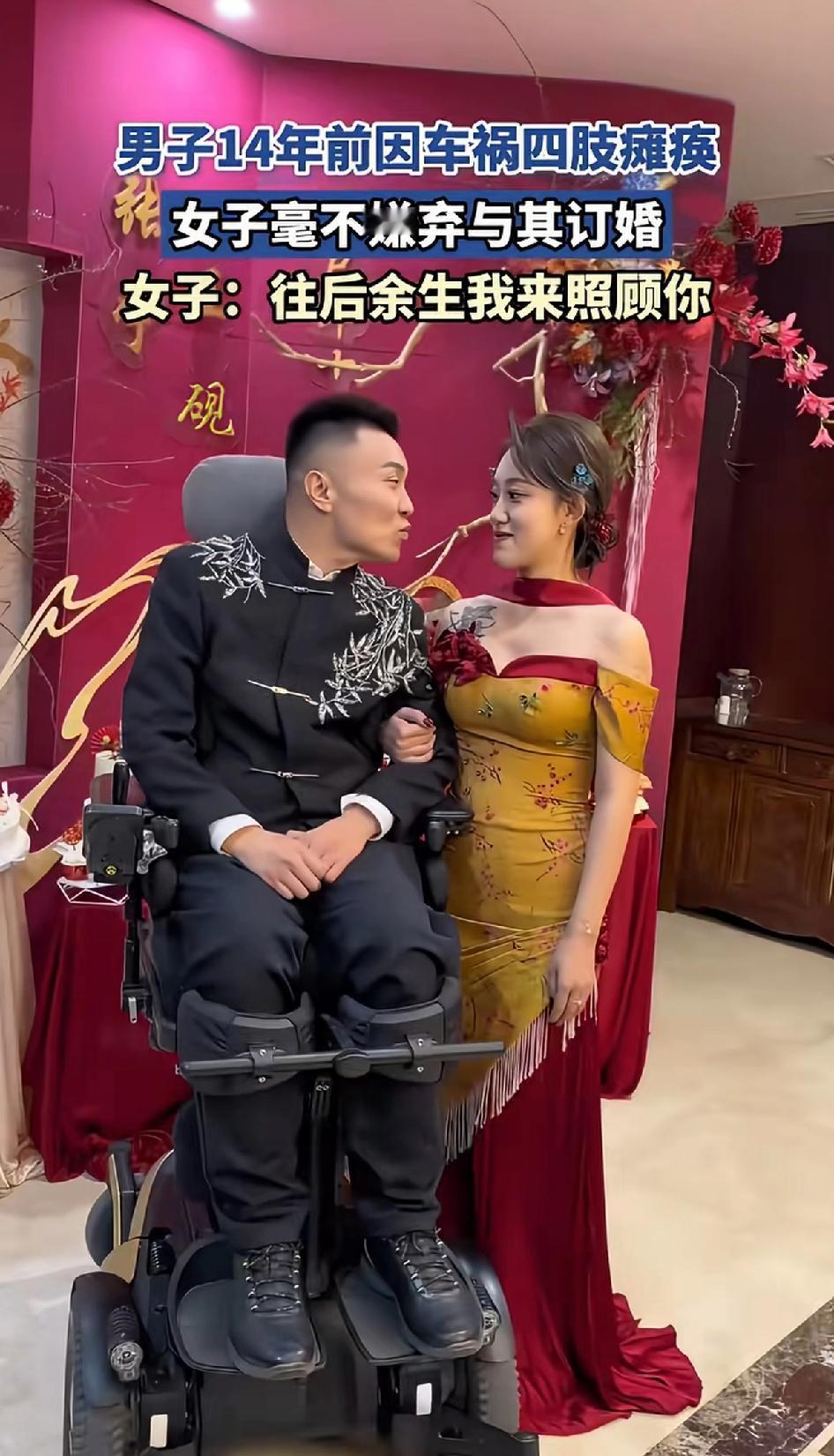 男子14年前因车祸瘫痪,女子丝毫不嫌弃与其定亲,女子:余生我来照顾你。浮躁的社会里还有这样重情义的女子真让人感动不已。 这样的爱情太难得。很多人在面对困难时可能就会选择退缩,而她却坚守着这份感情,不离不弃。 现实生活里多少夫妻能经住贫穷富贵、疾病健康的考验。 这让我想起那句“无论贫穷还是富贵、疾病还是健康,都相伴一生”。他们的故事就是对这句话最好的诠释,也让我们看到了爱情最纯粹、最美好的模样,希望他们能一直相互扶持,把日子过得甜甜蜜蜜。 天天看新闻要么原配斗小三,要不然就是骗婚、骗钱,都是一些鸡鸣狗盗,为了钱不顾一切的人和事,哪有什么真爱! 现在看到这个新闻让我这个中年人,再一次相信了纯粹的爱情是存在的。只不过太稀少,太难得了。