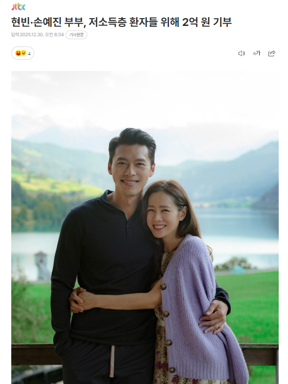 玄彬x孙艺珍夫妇为低收入层患者捐款2亿韩元30日玄彬所属社VAST方面表示,玄彬和孙艺珍夫妇在年末为需要医疗支援的患者们进行了捐款。此次善款将用作三星首尔医院幼儿青少年患者和经济困难的低收入层患者的治疗费,共捐款2亿韩元。对于此次捐赠,两人表示:“希望能对接受治疗的患者和家属带去些微帮助。”
