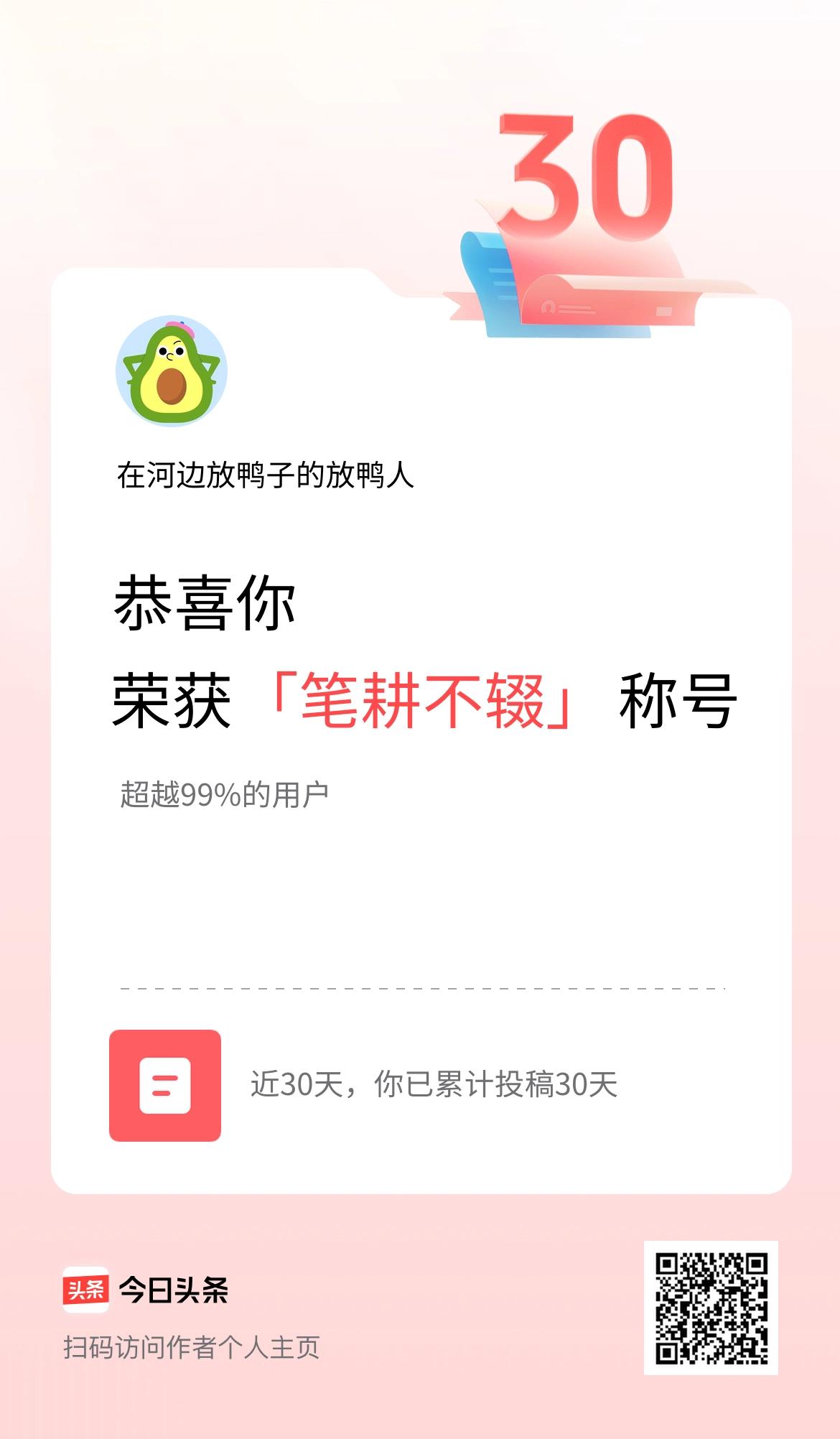 我在头条30天内投稿打卡30天,获得“笔耕不辍”称号