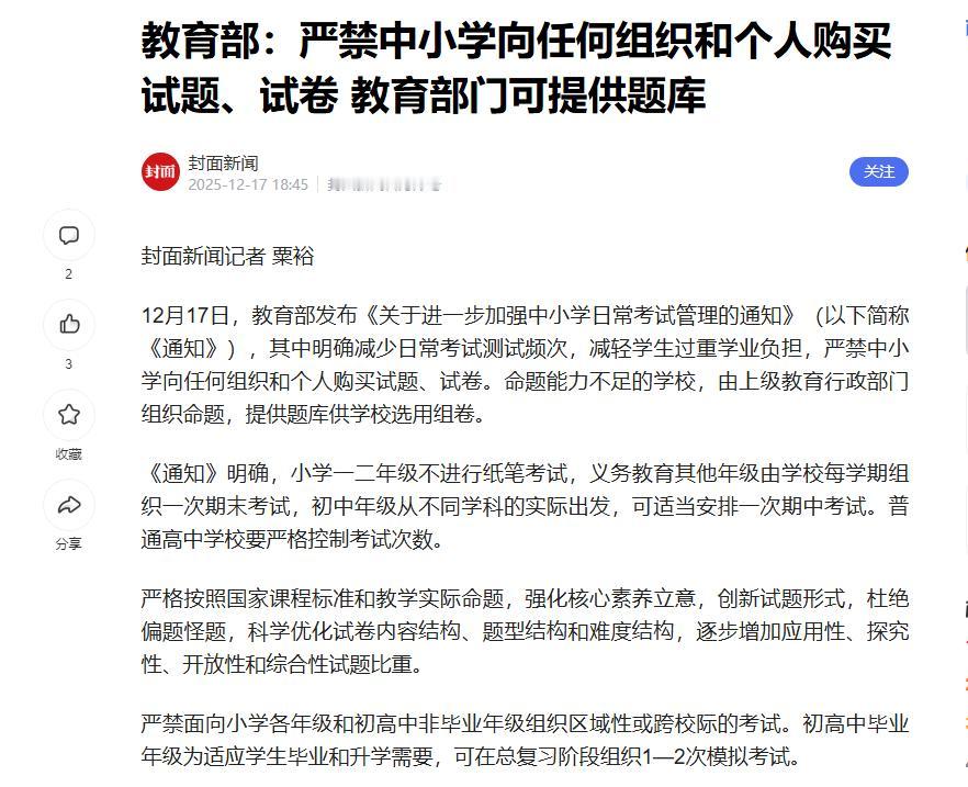看到教育部那个新通知,我脑子都空了一下! 教育部明确表示:严禁中小学向任何组织和个人购买试卷。我第一反应就是:那“周周测”“月月练”是不是也没了?还真是,初中最多一次期中一次期末,小学一二年级纸笔考试直接取消。等于说,学校层面靠刷题提分这条路,直接被堵上了。 对于很多习惯了“题海战术”的学校来说,这简直是釜底抽薪。以前初中那是周周有测验、月月有排名,现在好了,除了期中和期末,平时那些五花八门的练兵场全被关停了。 这事儿发生后,最先感到不知所措的其实是老师。很多年轻老师入职以来,习惯了拿来主义,市面上现成的卷子多好用啊,题型刁钻、考点全面,拿过来一考,分数一排,谁好谁差一目了然。 现在突然不让买了,得自己出题,还得贴合学生实际,一下子就把很多人的教学节奏给打乱了。学校里那种依靠疯狂刷题来提分的流水线模式,瞬间被按下了暂停键。 紧接着炸锅的就是家长群,有人说:“完了,这不就是当年的‘快乐教育’又要回来了吗?” 还有人担心:“现在学校不考了,孩子玩开心了,将来中考高考看分数的时候,谁给他们的未来买单?”这种担心太真实了,也太扎心了。 家长们怕的从来不是考试这张纸,而是怕在没有参照物的环境里,自己的孩子在不知不觉中就被别人甩在了身后。毕竟大家都默认了一条规则:多考多练才能出成绩,分数才是硬道理。 但家长的焦虑根子不在卷子上,而在对未来的不确定性上。大家怕孩子现在“快乐”了,将来毕了业就失业。可是以前那种靠买卷子堆出来的“高分”,真的能保住孩子的未来吗? 过去这几年,学校里的怪现象还少吗?很多学校为了追求所谓的升学率,不管三七二十一,买来一堆校外的卷子。 那些卷子为了显示水平,故意出一些偏题、怪题,把题目弄得绕七绕八。孩子们为了做对这些题,只能死记硬背,把脑子练成个机械的数据库。 结果题刷了一箩筐,到了现实生活中,连个菜都认不全,遇到实际问题两眼一抹黑。这种教育,把孩子的灵气都给磨没了,剩下的只有对学习的厌恶。 这次的“禁卷令”,说白了就是想把教育从这种功利化的泥潭里拉出来。 国家不是不让考试,而是不让那种偷懒的、没有针对性的“垃圾考试”继续祸害孩子。真正的教育,不该是把孩子困在书桌前和一堆印刷品死磕。 试想一下,如果孩子们不再被这些买来的卷子压得喘不过气,他们能干点什么?他们可以有时间去菜市场转转,看看萝卜白菜多少钱一斤,感受一下什么是人间烟火。 他们可以去公园里蹲半天,看看蚂蚁是怎么搬家的,弄明白大自然的规矩;他们甚至可以去社区里当个志愿者,帮帮孤寡老人,在这个过程中明白什么叫责任和担当。 这些看似“没用”的事情,其实才是教育最核心的部分。一个孩子,只有当他能从书本里抬起头,去触摸真实的世界,去解决实际的问题,他的大脑才会真正转动起来。 这时候培养出来的,不再是千篇一律的“做题机器”,而是有血有肉、有想法、有能力活出自己样子的人才。 不管怎么说,这一步如果不迈出去,教育就永远是个死循环。我们不能一边喊着要创新人才,一边又把孩子们按在题海里不许抬头。 减少那些无效的内卷,让考试回归到检验成长的本质上来,这才是给焦虑降温的最好办法。 面对这样的巨变,你是觉得终于松了一口气,还是担心孩子将来会更难适应竞争?欢迎到评论区讨论。 本文首发于今日头条 信息来源:封面新闻