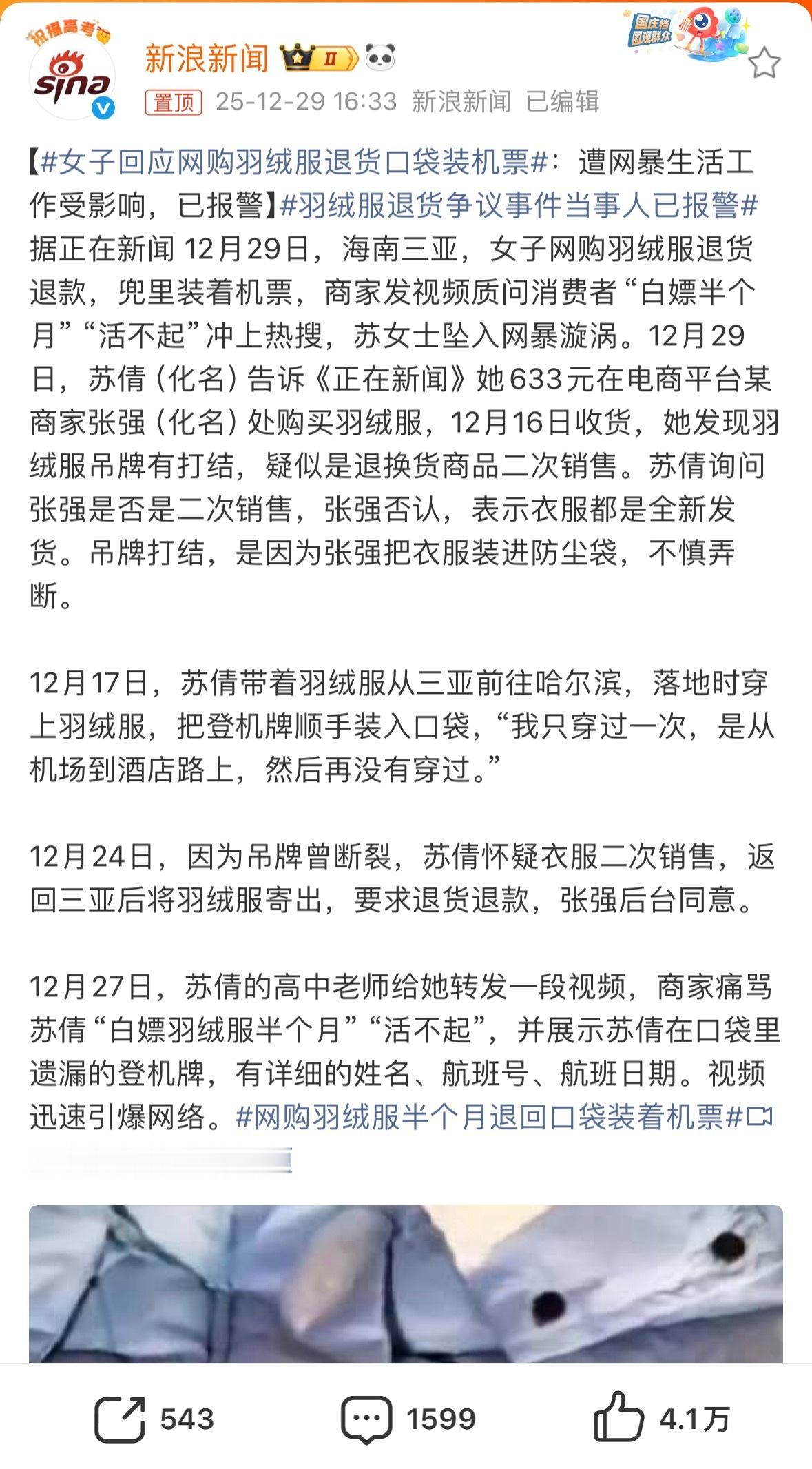 女子回应网购羽绒服退货口袋装机票这玩意你捋捋时间线就看出猫腻了。她自己说16日收货,发现吊牌有问题,17日去哈尔滨时带着这件羽绒服去的,然后穿了个从机场到酒店的路程,回海南24日退货退款。你告诉我这不是白嫖是什么啊?谁家好人打算退货的衣服还穿出去啊? 退货羽绒服兜里有机票买家否认白嫖
