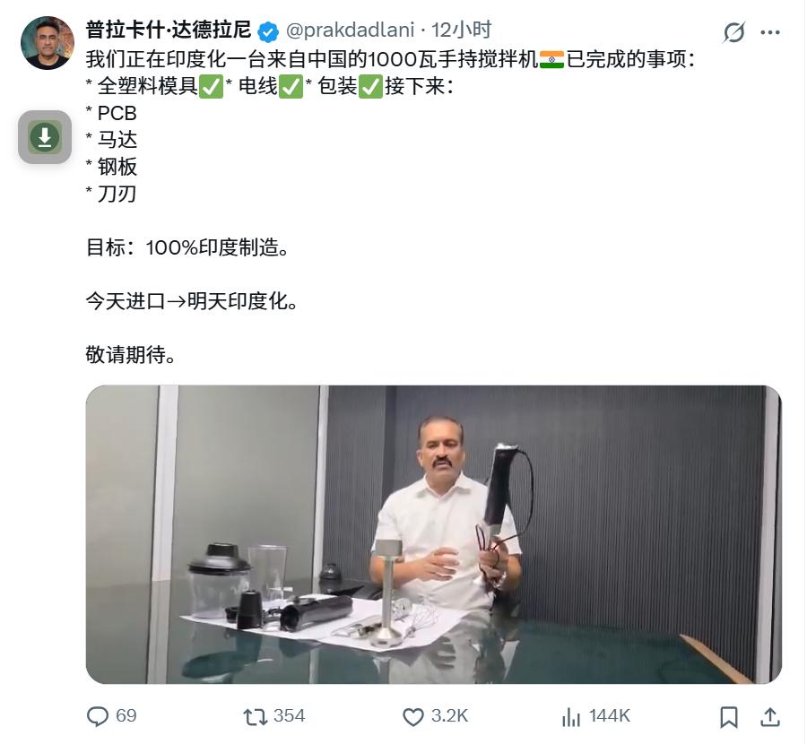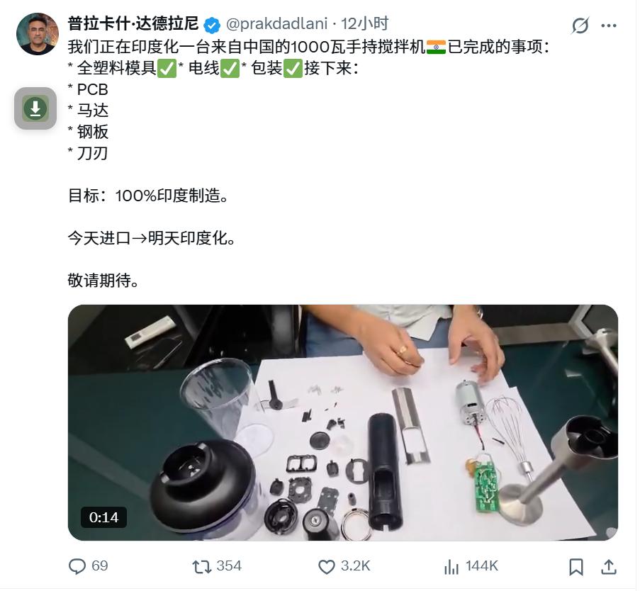 近日,在国外一社交平台上,印度一个具有30年电子制造经验的企业家光明正大的拍视频分享自己拆解中国制造的家用破壁机、搅拌机,并扬言要通过逆向工程,拷贝这台机器的所有配件,然后把这台机器变成印度制造。 站在中国人的立场看,这类“买来—拆解—复制—贴牌”的印度制造现象,说好听点是逆向工程,说直白点,就是低成本模仿驱动的产业起步路径。它不新鲜,也并非印度独有,但放在今天的中印制造对比中,问题暴露得尤为刺眼。 先讲态度:这不值得道德谴责,但绝不值得尊重,更谈不上值得学习。 因为从工业史看,逆向工程本身并不“原罪”。日本、韩国、甚至中国早期制造业,都经历过“学—仿—改—超”的阶段。但关键不在“抄没抄”,而在抄到哪一步停、是否转向原创、有没有制度边界。而目前印度的问题恰恰在于——大量企业停留在“拆解即终点”的阶段。 从这位印度企业家的表述可以看出一个非常现实的事实:中国制造不是被“学不会”,而是被“直接拿来”。模具、电机、PCB、电路方案、结构设计,几乎是“模块化搬运”。这说明什么?说明中国制造在小家电领域,已经不是单一技术优势,而是体系化优势:设计、供应链、工艺、成本控制全部打包,别人只能整机拆,而拆不出生态。 那为什么印度这种情况“严重”?原因有三点,非常现实,也很残酷。 第一,印度制造的政策导向,本身就默认“复制优先”。“Make in India”在执行层面,更重视“产地转移”和“就业数字”,而非技术来源的清白性。只要在印度组装、生产、雇人,就算成功。这种政策环境,天然纵容低端复制,而非原创研发。 第二,印度工业文化更偏“商业驱动”,而非“工程驱动”。中国制造的底色是工程师文化——结构优化、工艺极限、良率控制;印度很多制造企业的底色是商人文化——只要能卖、能压价、能规模化,就够了。于是“抄得快”比“做得深”更重要。 第三,也是最致命的:印度在供应链深度上,远未形成闭环。他们可以复制产品,但复制不了中国背后那一整套“随叫随到”的零部件网络和工程响应速度。这决定了印度可以做“看起来一样”的产品,但很难长期做“质量稳定、持续迭代”的产品。 从中国人的角度看,这件事真正该警惕的,并不是“被抄”,而是被低估。今天他们抄的是破壁机、榨汁机;如果哪天中国制造停在低端、放弃升级,那被抄的就会是整个市场。 抄袭,是弱者追赶强者时最省力的方式;但如果一个国家长期把抄袭当产业路径,它就永远只能活在别人的产品说明书里。印度制造现在走的,是“复制中国的昨天”;而中国制造真正要做的,是不断让对方“抄不动明天”。