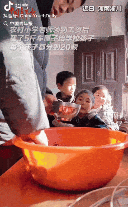 河南淅川,乡村老师发工资后,先给学生们买了车厘子,一人20颗。老师发现一个小男孩只吃了两颗,还剩18颗。老师问他为什么不吃啊?他说,要留给他姐姐吃。 乡村小学,学生几乎都是留守儿童,学生人数也不多。老师发了工资后,就给学生们买了车厘子,想让同学们尝尝没有吃过的水果。老师分给每人20颗,一个男孩只吃了两颗,剩下的要留给姐姐。他说姐姐也没有吃过,想让姐姐尝尝。 老师看到男孩午休的时候,趴在桌子上,竟然用胳膊搂着车厘子,他也没有吃掉。老师非常感动,就给男孩又装了一小瓶,偷偷放到男孩的书包里,给他一个惊喜。 小男孩看着年龄不大,面对好吃的食物,能够控制自己,还能想到跟姐姐分享,这真是不容易。老师的举动是播撒温暖,孩子的回应是传递温暖。在留守儿童的世界里,陪伴的缺失让他们早早学会了体谅和分享。20颗车厘子,串起了师生情,也串起了姐弟情。 现在物质丰富了,老师们也经常会给孩子买小礼物。昨天,我家孩子因为美术课上获得了20个“优”,老师奖励了一支辣椒形状的笔,孩子回来很开心。有的时候,老师还会奖励小零食,一般就会和同学分享。 网友说: “我来自西部国家级贫困县的大山里。我记得初一学《南州六月荔枝丹》这篇课文时,语文老师买了荔枝,每人分2颗,那是我第一次吃荔枝,现在定居深圳,每年荔枝出来,赶紧给老师邮一箱。”虽然是小小的两颗荔枝,但是在孩子心里种下了温暖的种子。 另一个网友说:“我想起我上小学学到《画杨桃》这篇课文时,从来没见过也没吃过。后来我当老师了,就给孩子们买了杨桃当教具,上完课后洗洗切切大家一起吃了,孩子们都很开心。” 我发现孩子就是这样,老师给的东西会让他们非常开心,即使只是小小一块糖。