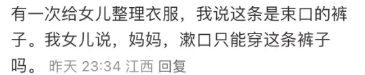 有一次给女儿整理衣服,我说这条是束口的裤子。我女儿说,妈妈,漱口只能穿这条裤子吗