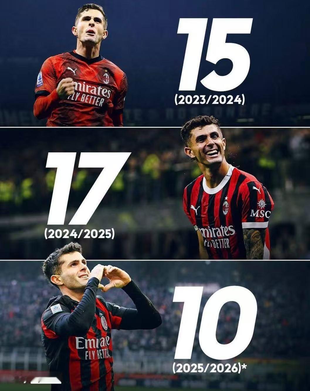 这个赛季普利西奇能进多少球? 普利西奇自从2023年夏天加盟米兰以来,保持着极高的进球率,目前已经连续三个赛季上双,分别是15(23/24)、17(24/25)、10(25/26)球,很多米兰球迷预计,普利西奇超越上赛季的进球数只是时间问题,看看能不能再进10个,争取突破赛季20+。