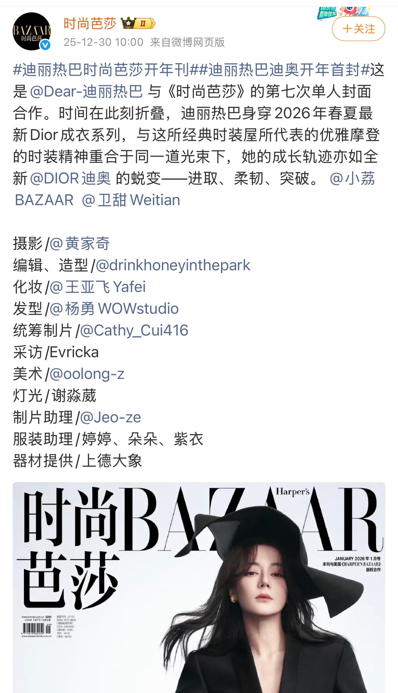 迪丽热巴时尚芭莎开年刊时尚芭莎封面释出,迪丽热巴时尚表现力好绝!迪奥开年首刊 姐姐太漂亮了!!!