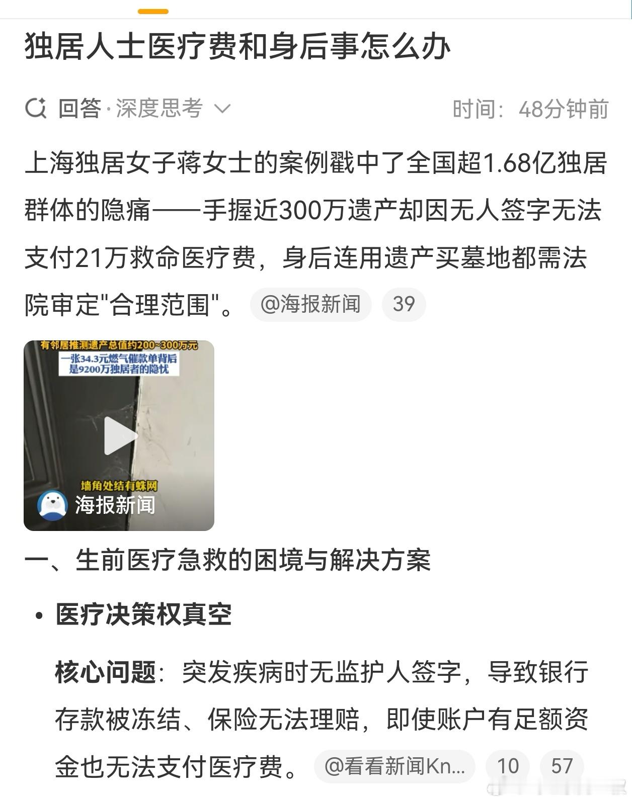 独居人士医疗费和身后事怎么办身后事其实也没什么。但是,医药费都没法支出,延(耽)误抢救,确实有点悲催。46岁,年纪并不大啊!