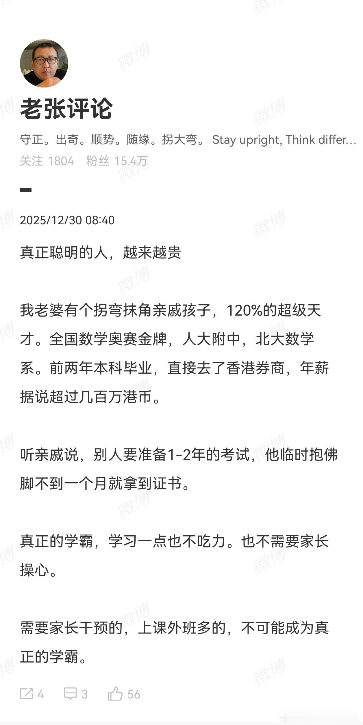 老张这话是大实话。现在,并不是不要人才,以后也是稀缺人才越来越金贵。但是,不是有文凭就是人才。能不能,会不会。是接触下来就知道的。我很清楚孩子的智商只是中等水平,从来没有对TA有过高期望,也就不费尽心机补课,各种要求好学校、高学历,只求平安。看到很多事情,很多人的行为特别可笑,才碎碎念多说几句。