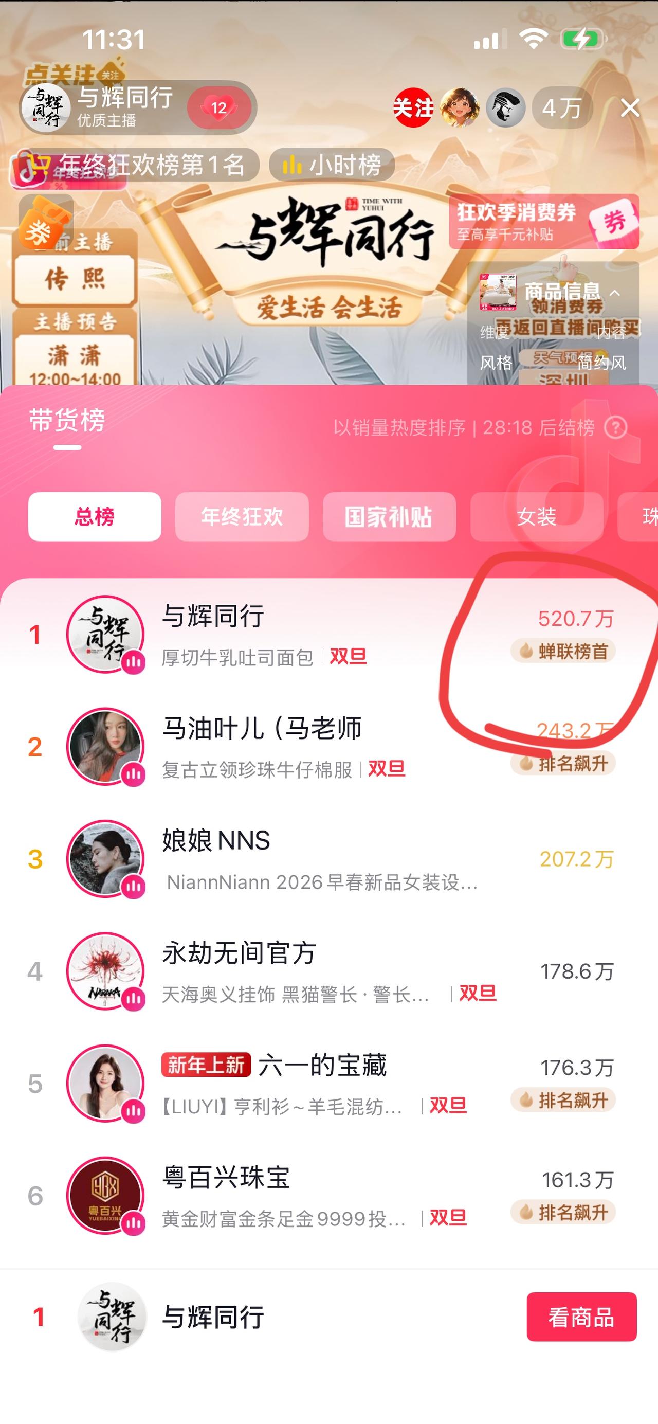 潇潇今天成了背锅侠, 今天早上一些没抢到定制吐司的朋友, 是因为今天早上小兰兰开播了, 很多朋友都不知道。 早上潇潇在小兰上早班, 大家看见潇潇就当成与辉同行了, 点进直播间就问潇潇什么时候上吐司, 潇潇说这是兰知春序, 买定制吐司的朋友, 你们走错了直播间。 等大家去与辉同行的时候, 呵呵呵, 吐司链接都下了。 所以潇潇就背锅了。 潇潇说这个责任她担不起啊, 感觉太无能为力了, 你们要怪就怪彪哥, 单量太少了。[大笑][大笑][大笑] 其实吧, 咱们不能再怪彪哥, 只要定制品上线, 他说自己都胆战心惊的, 就怕大家蛐蛐他。 所以这次还是让潇潇背锅吧, 咱们放过宇辉。[呲牙][呲牙] 听说高大上直播间来湖北跨年了, 为期两天。 看背景, 是在黄鹤楼门口卖货。 直播间人气不错, 两万多人。 能不好吗? 高科技上线, 还有五分钟五十个福袋, 福袋里据说是牛奶, 这可是大手笔啊。 虽然说成本不低, 但是不加粉丝团不能参加抢福袋, 这算盘不错, 粉丝上涨, 人气增加, 还清理库存。 这是新官上任的第一把火, 也是2025年的第一次大专场, 怎么也得热浪滚滚啊。 但是看热卖榜, 依然被小兰兰碾压, 还得继续努力啊。 散会! 董宇辉