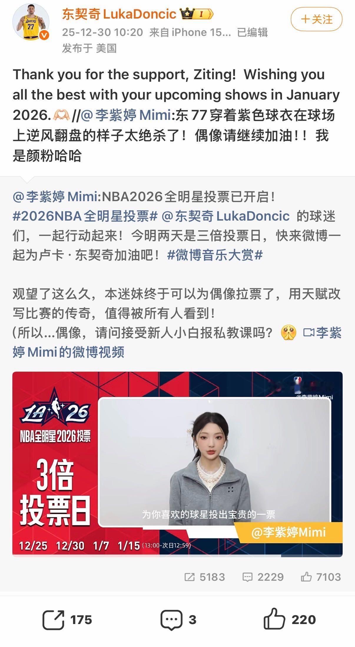 李紫婷是东契奇颜粉NBA追星天花板就是偶像为自己的音乐会宣传吧!火箭少女前成员为东契奇拉票,自曝颜粉身份,居然还让球星隔空期待她1.17的生日音乐会,这排面直接拉满!