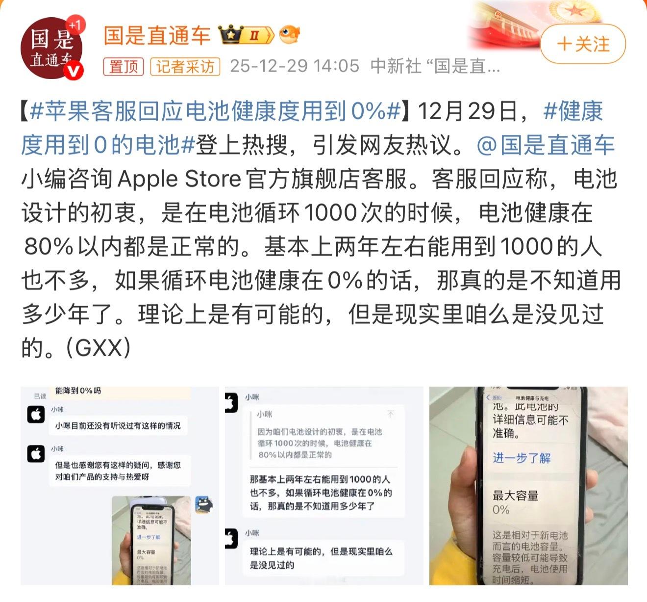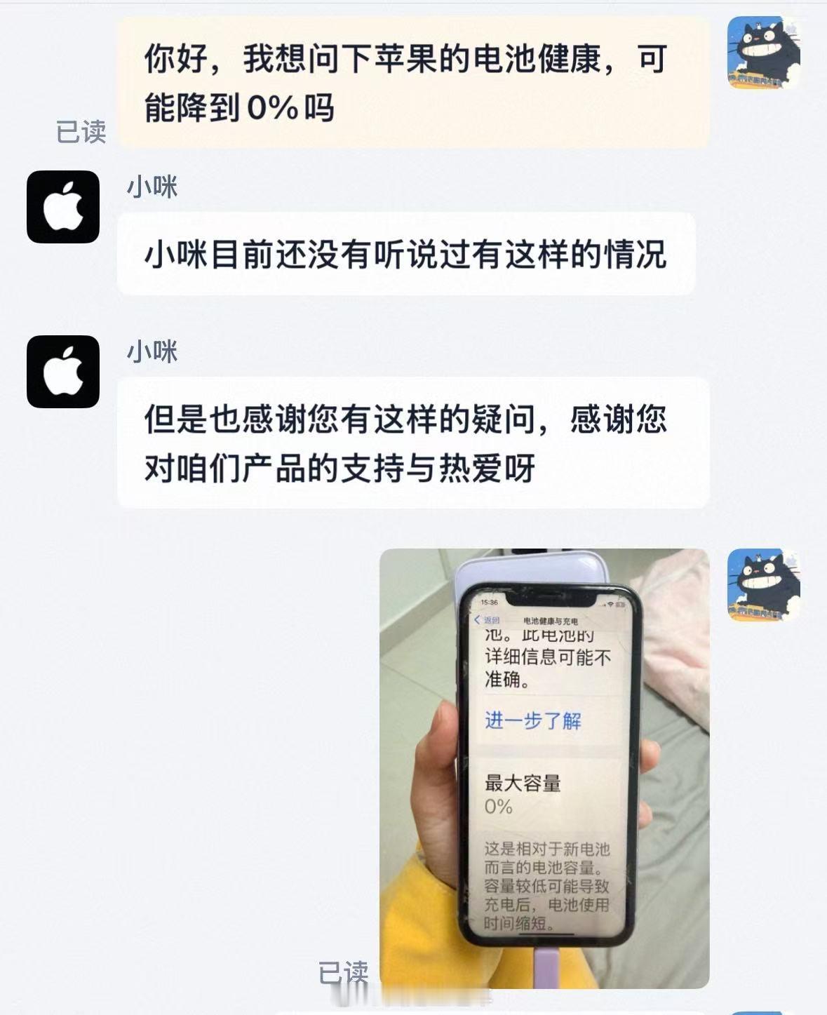 苹果客服回应电池健康度用到0%说真的,这种问题就没必要去问客服了,为难人家干什么呢?客服对这个基本上是一无所知,只会说一些套话。截图上这个机子看着像是iPhone XR,2018年发布的机子,正常使用的话,即使是同一块电池也很难到0%,大概率是电池出故障了。老张聊数码