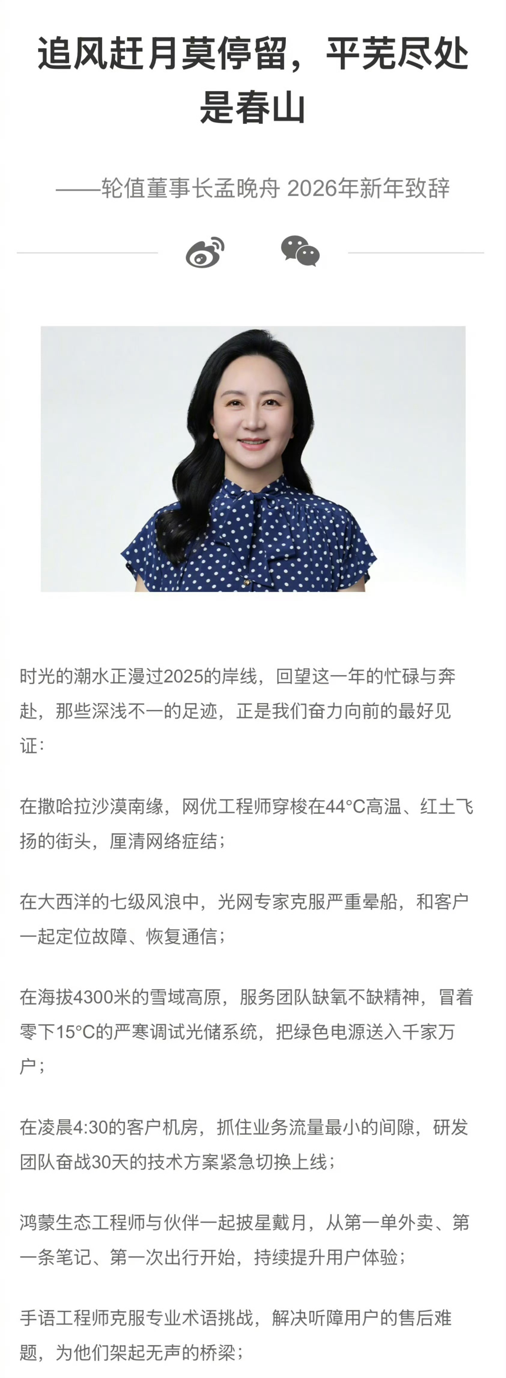 孟晚舟新年致辞谈华为2026战略前阵子去体验了 问 界 M 9 ,那个 智 慧 座 舱 的 流 畅 度 真的惊到我! 鸿 蒙 生 态 原来已经这么“无感”又自然了。孟总讲的 行 业 数 智 化 和 A I 赋 能 ,突然让我觉得 科 技 不是飘在天上的概念,它就藏在一次顺畅的 通 勤 、一个 智 能 家 居 的联动里。2026年,希望自己也能找到这样“落地”的方向,哪怕只是写一行有用的 代 码 ,也算参与了未来吧。