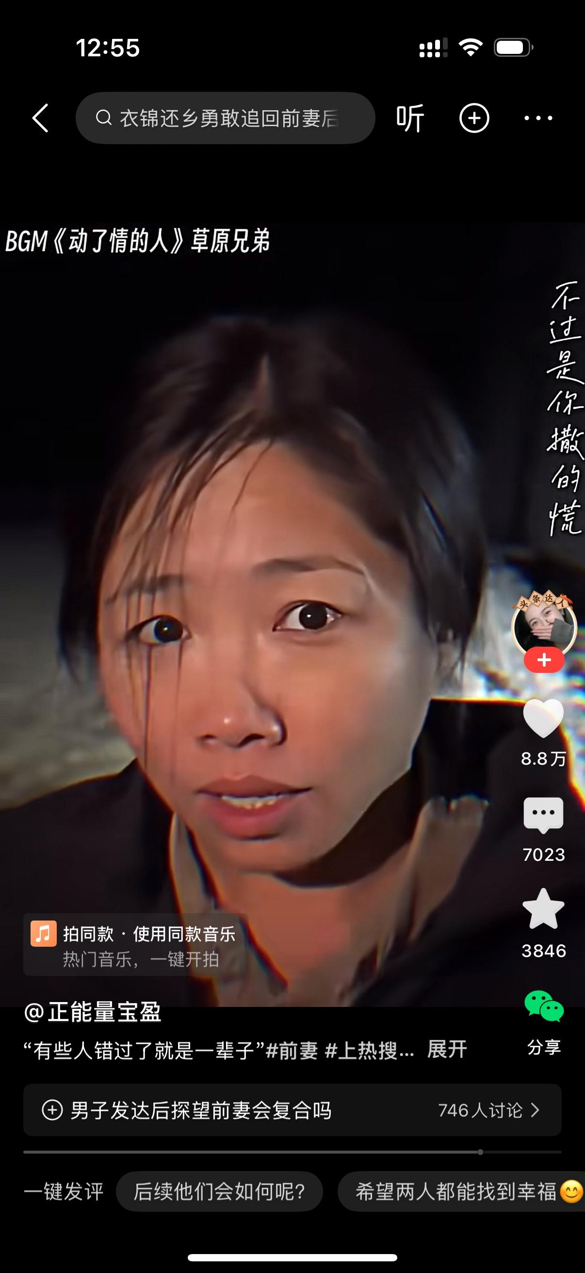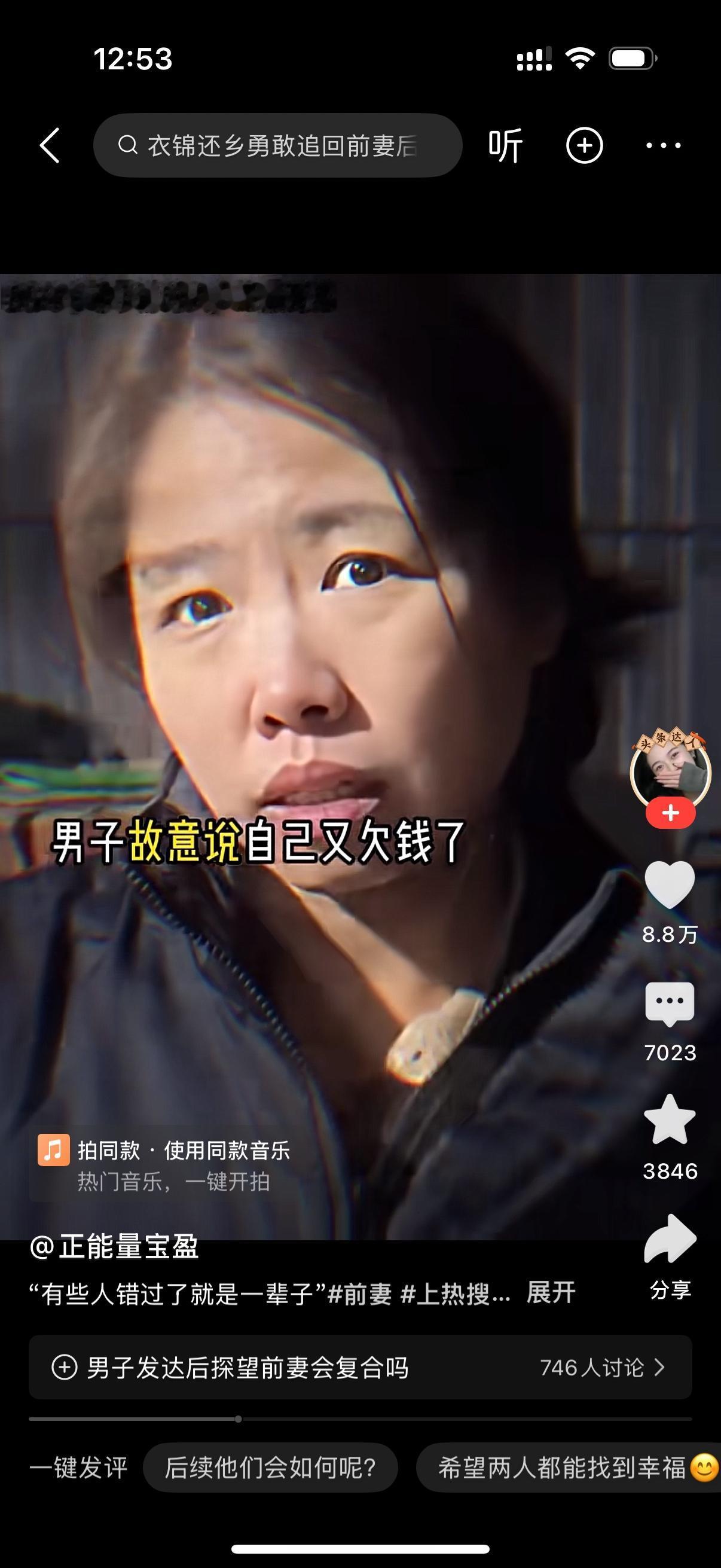 男子挣钱了,想起自己当年因欠了一屁股债 ,和前妻离婚就跑路了。男子来到前妻家里,故意说自己又欠钱了,找她借点。前妻看到他,破口大骂,知不知道这些年我是怎么过的?你死哪里去了?男子看着她,没说话。前妻问他,借多少?男子说,2万。前妻走回屋里,找父亲要钱。父亲放下狠话,你要再借钱给他,就不要在我家住了。男子已经不抱希望了。前妻却把钱递给他。男子很感动,说我给你打个借条吧。前妻说,不用了,这些年你欠我的还少吗?男子说,走,上车看看。女子说什么,上车?男子说我翻身了,有钱了。前妻喜极而泣,那是真的为前夫高兴,发自内心的那种。