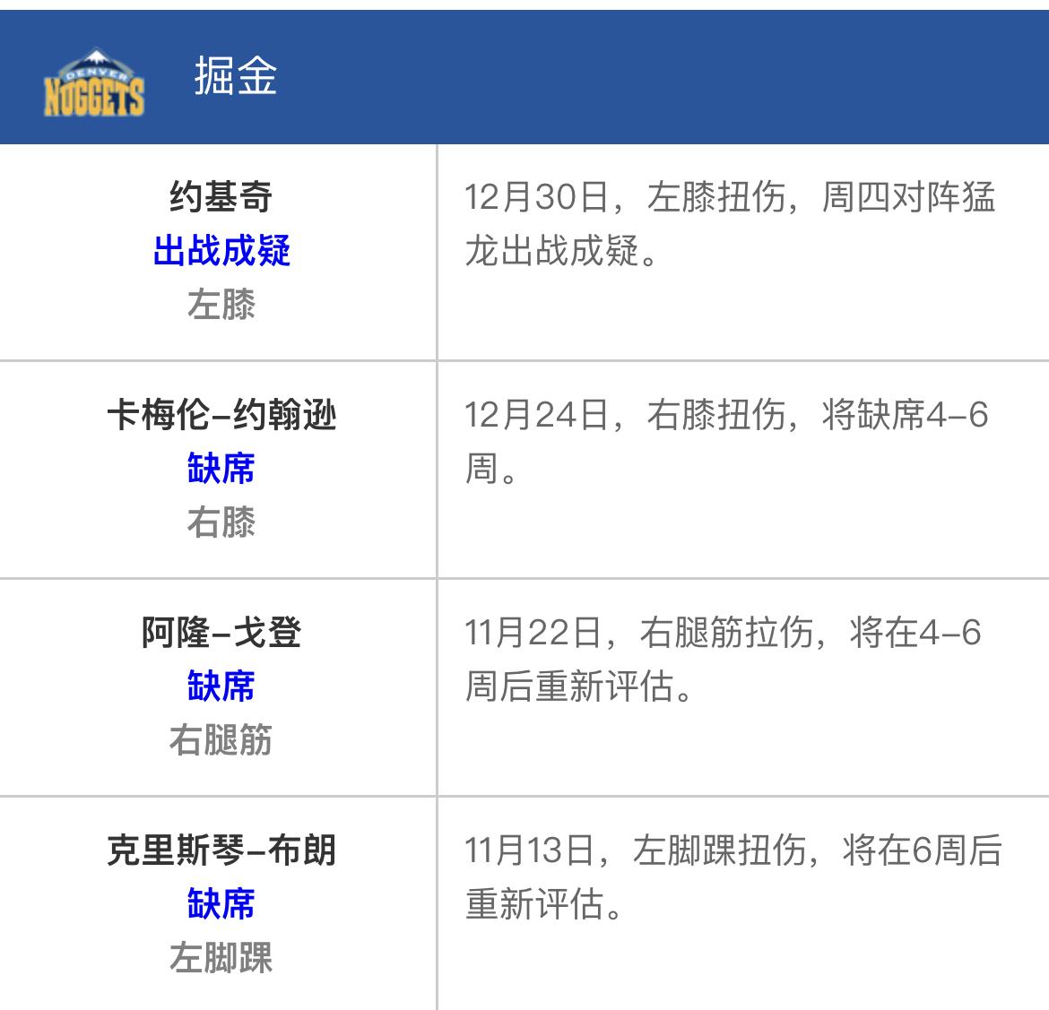 约基奇受伤,掘金首发就伤的剩下穆雷一个了。 🔸约基奇周四对阵猛龙出战成疑; 🔸卡梅隆约翰逊,12月24日,右膝扭伤,将缺席4-6周,预计是缺席至 1 月底; 🔸戈登,11月22日,右腿筋拉伤,将在4-6周后重新评估,预计缺席至 1 月中旬; 🔸布劳恩,11月13日,左脚踝扭伤,将在6周后重新评估,预计缺席至 1 月初。 好在掘金 1 月赛程并不难,除湖人、雄鹿、活塞以外,剩余对手皆为附加赛实力。 考验穆雷单独带队的实力了,全明星第一阶段投票结束,穆雷排名 14,这段期间,如果穆雷打出出色表现,本赛季有很大希望入选全明星。