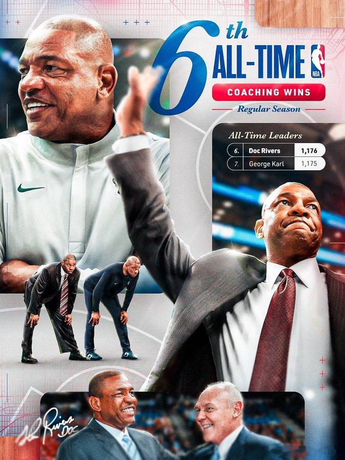 雄鹿今日击败黄蜂,凭借这一胜,主帅里弗斯的执教胜场数来到1176场,超越乔治-卡尔,升至历史第6位。
