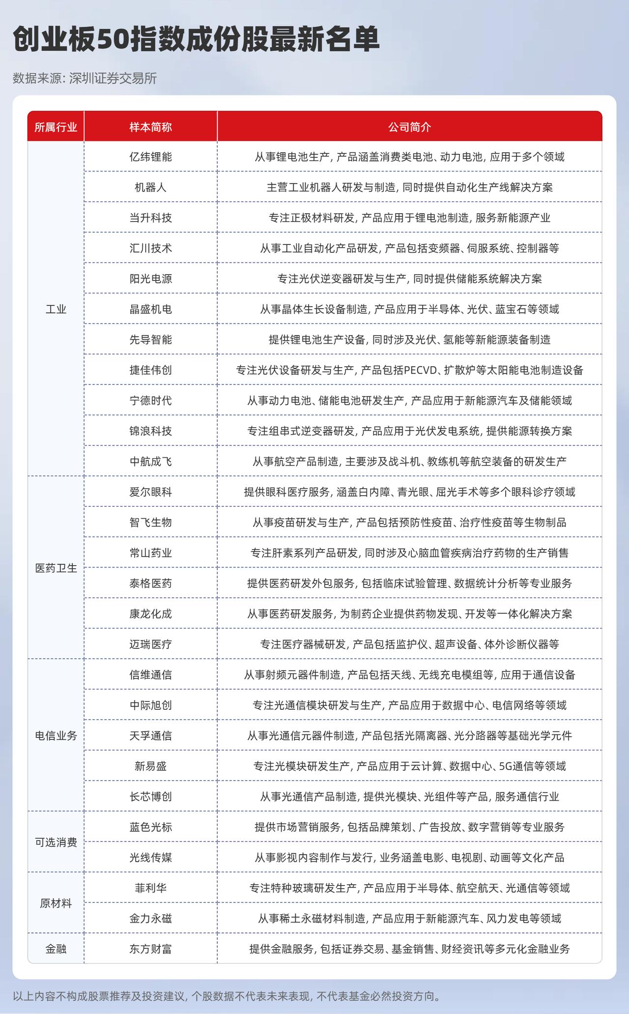 创业板50指数成分股名单(建议收藏) (向右滑动图片查看完整名单) 创业板 50 指数是深交所编制的成分股指数,选取创业板市场规模大、流动性佳的 50 只龙头企业作为样本, 旨在反映最新的创业板核心优质企业的股价表现,是衡量创业板头部企业估值与景气度的核心指标。 近日,创业板 50 指数的成分股调整举动颇受市场关注:调入常山药业、菲利华、长芯博创等个股,同时调出特锐德、芒果超媒、光弘科技等 5 只个股。