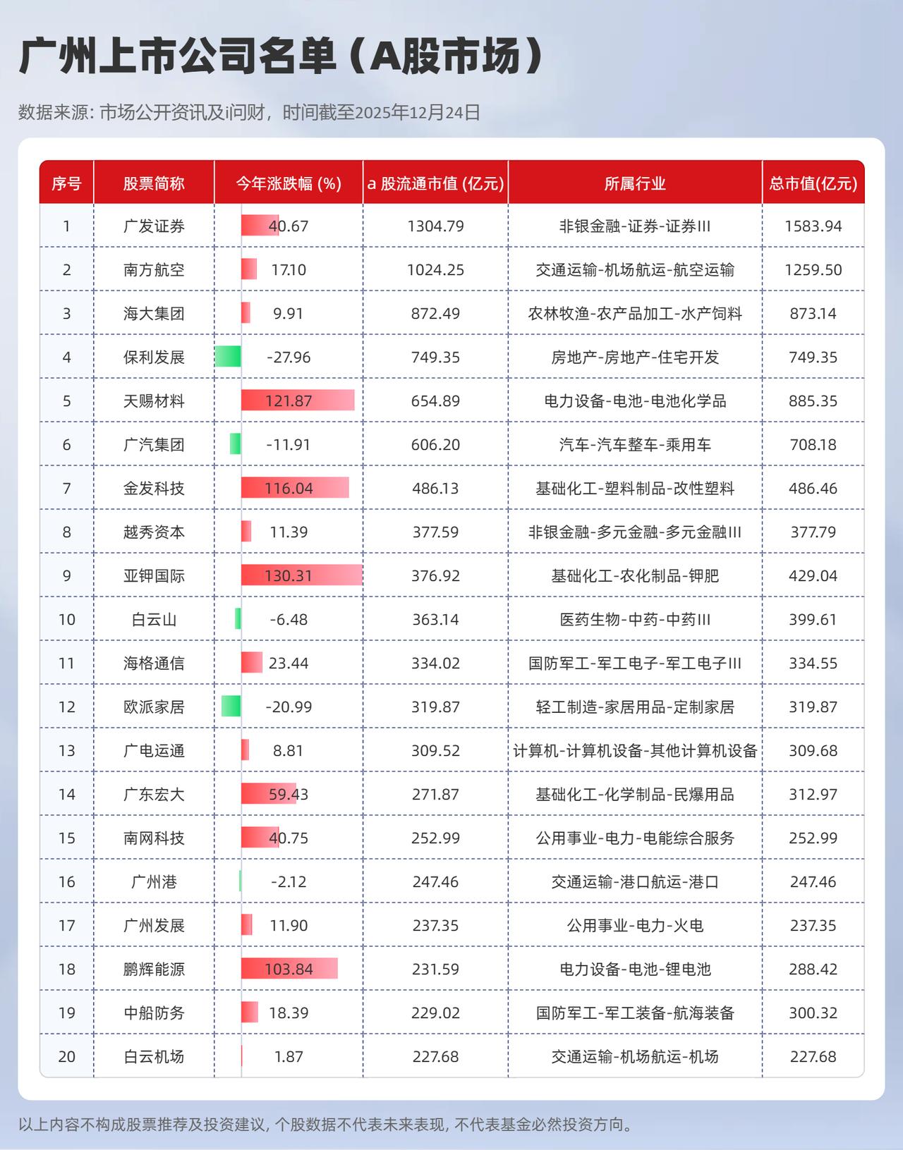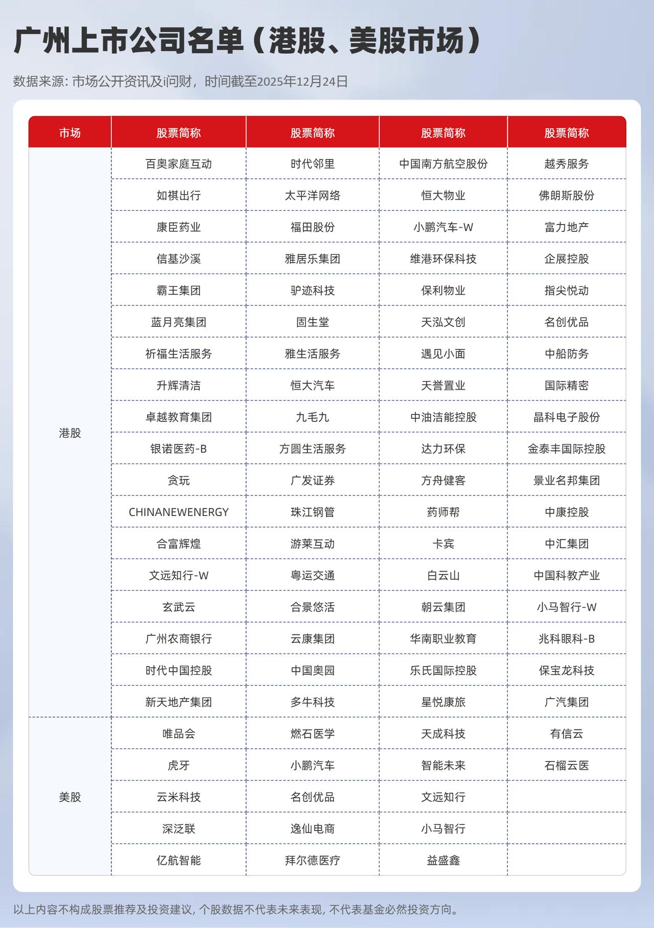 广州上市公司名单出炉(含A股、港美股) (向右滑动图片查看完整名单) 广州是粤港澳大湾区的核心引擎城市,该地区上市公司群体往往兼具产业深度与科创活力。 这些企业不仅是经济高质量发展的核心动力,更在资本市场中呈现出多元化的投资价值。 A股广州上市公司名单 A股市场中,广州上市公司有广发证券、南方航空、海大集团、天赐材料等,涵盖证券、航空运输、水产饲料、电池化学品等多个领域。 港美股广州上市公司名单 港股市场中,广州上市公司有百奥家庭互动、如祺出行、康臣药业、信基沙溪等,涵盖网络游戏开发与运营、智慧出行、医药制造、酒店用品等领域。 美股市场中,有唯品会、虎牙、云米科技、深泛联、亿航智能等上市公司,涵盖电商、游戏直播、家用电器、金融服务、低空经济等领域。