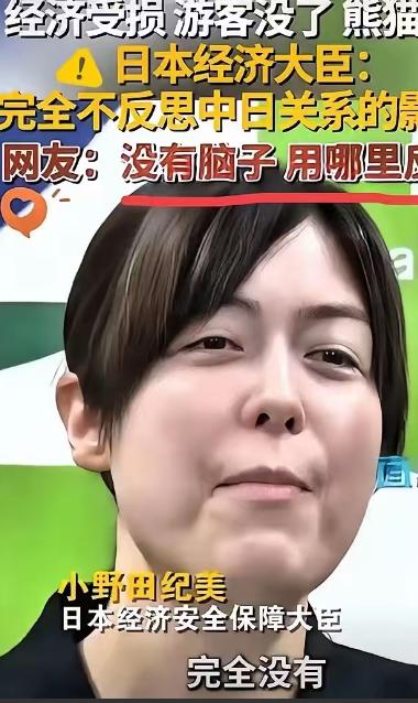 不出意外,果然被我猜中了!日本不怕中国制裁,不怕经济下滑,不怕航班取消,不怕拉走熊猫,不怕旅游业萧条,不怕水产业萎靡不振。那日本怕什么?日本的小野田纪美,嘴巴是真硬,公开表态绝不反省中日关系,一副“爱咋咋地”的架势。   先给大家说说这位小野田纪美是谁,今年42岁的她是日美混血,出生在美国芝加哥,一岁起就在日本冈山生活,后来毕业于拓殖大学。   她可不是普通政客,现在是日本参议院议员,还是高市早苗内阁的核心成员,身兼经济安全保障担当大臣和外国人政策担当大臣两职。   有意思的是,她还有双重标签,既是个动漫爱好者,之前还在游戏公司工作过,经常在社交平台分享Cosplay经历吸粉;同时也是坚定的右翼,高市早苗能当选首相,她功不可没,之前还担任过高市阵营“早苗之队”的队长,两人政治绑定得很紧。   说白了,她敢这么嚣张,不是没背景的,但问题是,她口中“无需反思”的背后,是中日关系持续恶化的现实,还有日本已经在承受的实实在在的损失。   咱们都能看到,中方已经重新实施了日本海产品进口限制,还发布了赴日旅游留学警告,明年1月赴日航班取消率都高达40.4%。   更让日本民众在意的是,所有在日大熊猫都会在2026年1月后全部归还中国,这意味着日本将首次进入“零熊猫时代”。   要知道,熊猫可不只是吉祥物,单是上野动物园的“晓晓”和“蕾蕾”,一年就能创造超过300亿日元的经济效益,周边几百家店铺都靠熊猫主题商品活着,熊猫一走,这些商家的日子可想而知。   更别提日本的渔业和旅游业了,早就因为中日关系紧张叫苦不迭。   北海道的渔业企业出口直接掉了三成多,京都的酒店入住率跌到六成以下,之前还有预估说中国游客减少可能让日本旅游业损失2万亿日元。   这些损失最终都落到了普通从业者身上,可小野田纪美坐在办公室里,轻飘飘一句“不在乎”就带过了。   其实小野田纪美敢这么硬气,背后不是真的不在乎损失,而是有明确的政治算计。   一方面,高市早苗内阁上台后,靠对华强硬姿态维持着67%的高支持率,不少日本民众认同“无需撤回涉台挑衅言论”,她的这番话就是在精准迎合这种右翼民意,巩固自己的政治基本盘。   另一方面,这也是为了转移焦点,就在放狠话前不久,她还因为在国会传播“中国人购岛威胁安全”的不实言论被揭穿,被迫鞠躬道歉,现在靠对华强硬能抵消自己失职带来的负面影响。   当然,这也是高市内阁遏华战略的一部分,她作为经济安全担当大臣,核心职责就是推动对华半导体限制、关键零件国产化,这番话不过是她政策立场的直白流露。   但不管她怎么嘴硬,有个事实没法改变:中日是搬不走的邻居,和则两利,斗则俱伤。   现在中日经贸还深度绑定着,2025年1-8月双边贸易额就有1960.7亿美元,日本对华制造业投资增幅高达55.5%。   这种“政冷经热”的平衡被打破,最终伤害的还是日本自己的经济和民众的福祉。   她所谓的“无需反思”,更像是一种不负责任的政治表演,既没有直面现实的勇气,也没有对本国国民福祉的担当。   中日关系走到今天这一步,不是某一位政客的狠话能决定的,但每一次不负责任的挑衅,都会给双边关系添上一道裂痕。   希望日方能早日认清现实,别再被右翼情绪裹挟,用理性务实的态度对待中日关系,毕竟真到了损失无法挽回的时候再反思,代价可就太大了。   以上都是个人观点,对此您有什么不同的看法,可以在评论区留言讨论!!!