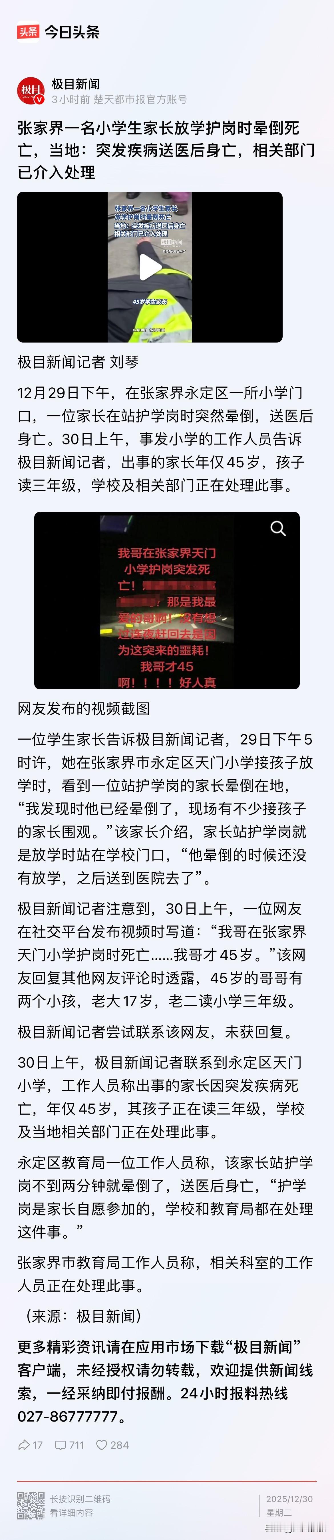 湖南张家界,一家长在站护学岗时突然晕倒,送医抢救后不幸身亡,事发后,这名家长的弟弟称,哥哥才45岁,有俩孩子,大的17,小的才上三年级,没想到就这么没了。而当地有关部门对此回应称,家长是自愿来站岗的,目前正在处理此事。 还有一位家长则目击了现场,这名家长表示,下午5点左右,她看到一位站护学岗的家长晕倒在地,我发现时他已经晕倒了,现场有不少家长围观,该家长还表示,家长护学岗就是在放学时站在学校门口,他晕倒的时候还没放学,之后就送去医院了。 而后涉事小学也表示,这名出事的家长是突发疾病,其孩子在上三年级,学校和当地有关部门正在处理,而教育局一工作人员表示,护学岗是自愿参加的,这名家长到场不到两分钟就晕倒了,送医后身亡。 事发后,有网友质疑,护学岗怎么会是自愿参加了的?不是学校要求,哪个家长愿意去站岗,护学岗本来就是学校的事。 还有网友说,我们学校也是这样,一年一次。 也有网友说,护学岗是自愿也好,不自愿也罢,都是为了孩子安全,作为家长要理解,再说这个家长,确实不幸,应该是自身疾病。 其实,自愿也好,不自愿也罢,作为学校是难逃其咎的。 为什么这么说,家长参与护学岗,让上学放学的学生能更加安全的过马路、进学校,使学校减少了安保人员和老师的投入,显然,学校对此是获取了收益,虽然这种收益并不直观,但本质上,家长参加护学岗的行为,让学校获得了成本节约。 对此,民法典第一百八十三条规定,因保护他人民事权益使自己受到损害的,由侵权人承担民事责任,受益人可以给予适当补偿。没有侵权人、侵权人逃逸或者无力承担民事责任,受害人请求补偿的,受益人应当给予适当补偿。 即如果这名家长因自身疾病突发意外死亡,虽然没有任何的侵权责任人,但是,作为受益人来说的学校,是需要给于其适当的补偿的。 那么,补偿多少才算是合适的,对此司法解释也规定,可以根据受害人所受损失和已获赔偿的情况、受益人受益的多少及其经济条件等因素确定受益人承担的补偿数额。 所以这样来看,补偿数额的多少,还是很不确定的,不过,再不确定,也不会超过赔偿的数额,否则的话,就和赔偿没有区别了。 事实上,大多数家长各自都有自己的工作,如果学校强制给家长安排“护学岗”,不仅会影响他们的工作和生活,同时也会导致他们对学校、老师产生不满情绪,既然有关部门明确了“护学岗”是以家长自愿为原则,那么,在安排上,就应该遵守自愿原则,而不是打着自愿的名义强行摊派。 有网友说,记得上学的时候,护学岗都是每个班级轮值,而每个班只有学习好的同学才有可能担任护学岗,虽然上学去的早,放学走得晚,但是也为自己有过这样的一份经历感到骄傲。 对此,你对本案有什么看法? —————————— 关注我,带你评析法律热点,关注冷暖人生。 文章原创,抄袭必究 头号创作者激励计划 家长站护学岗时晕倒身亡 当地回应