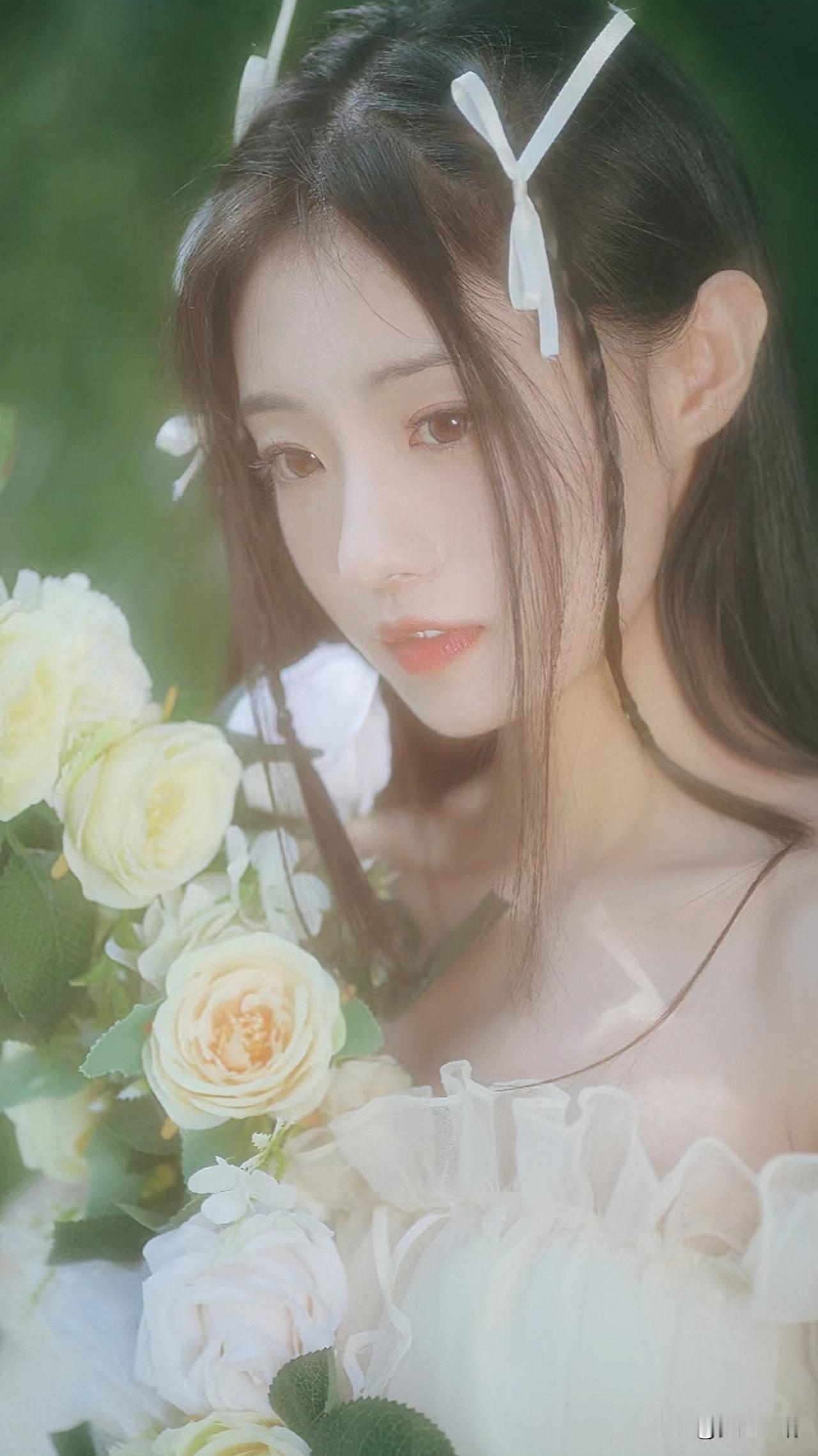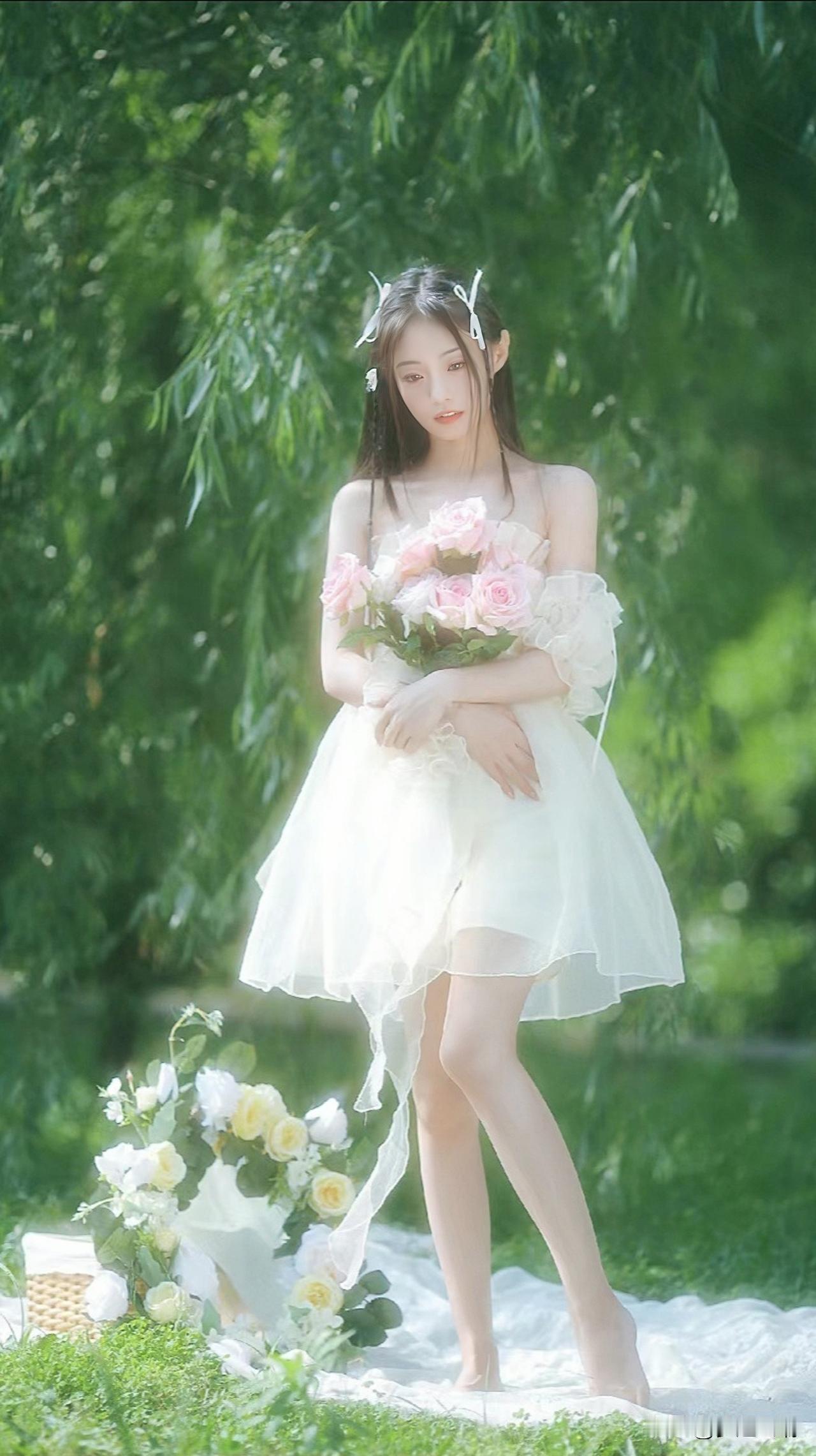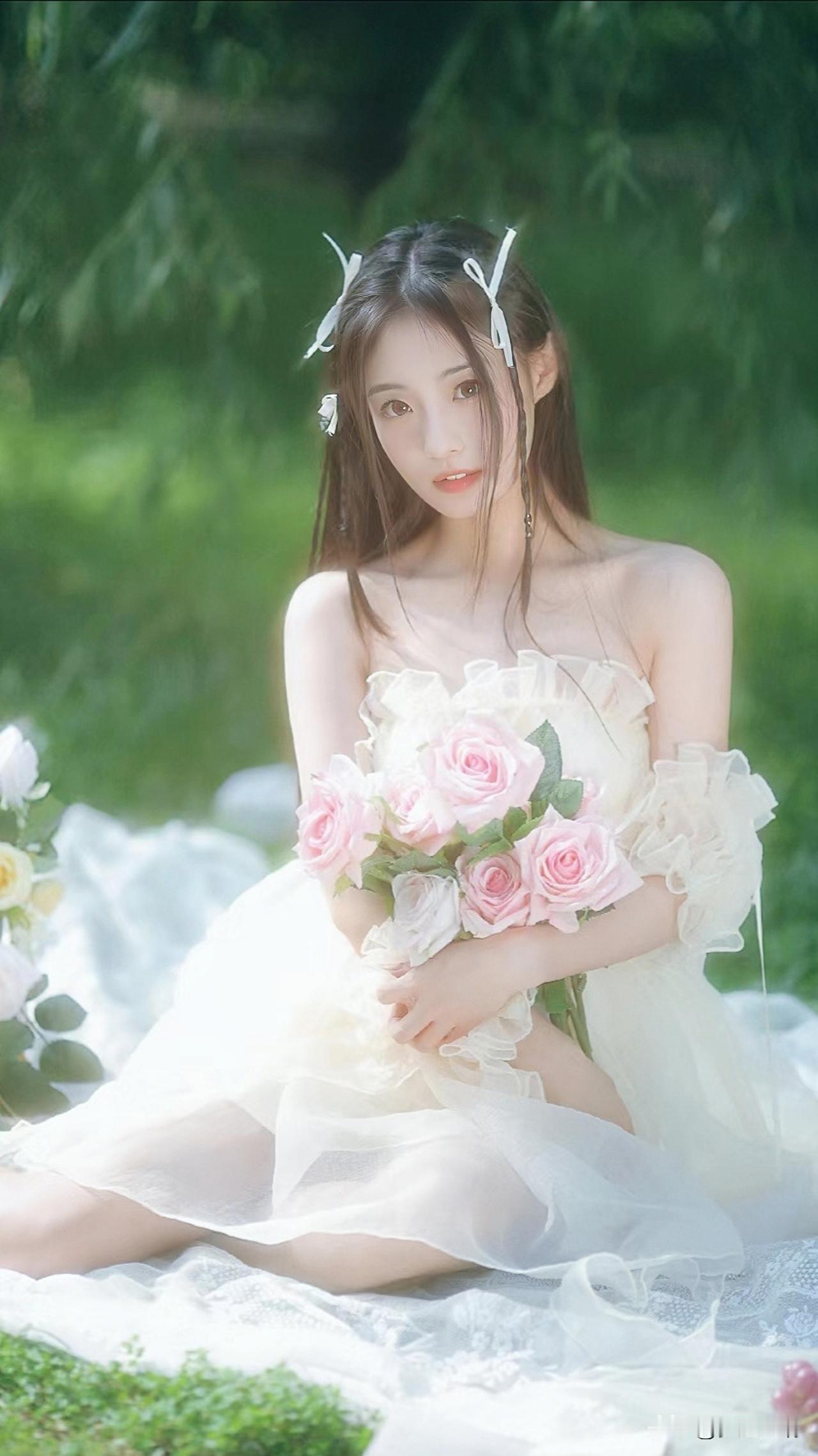 梦幻花园中的甜美少女,手捧粉色玫瑰,宛如童话中的公主。