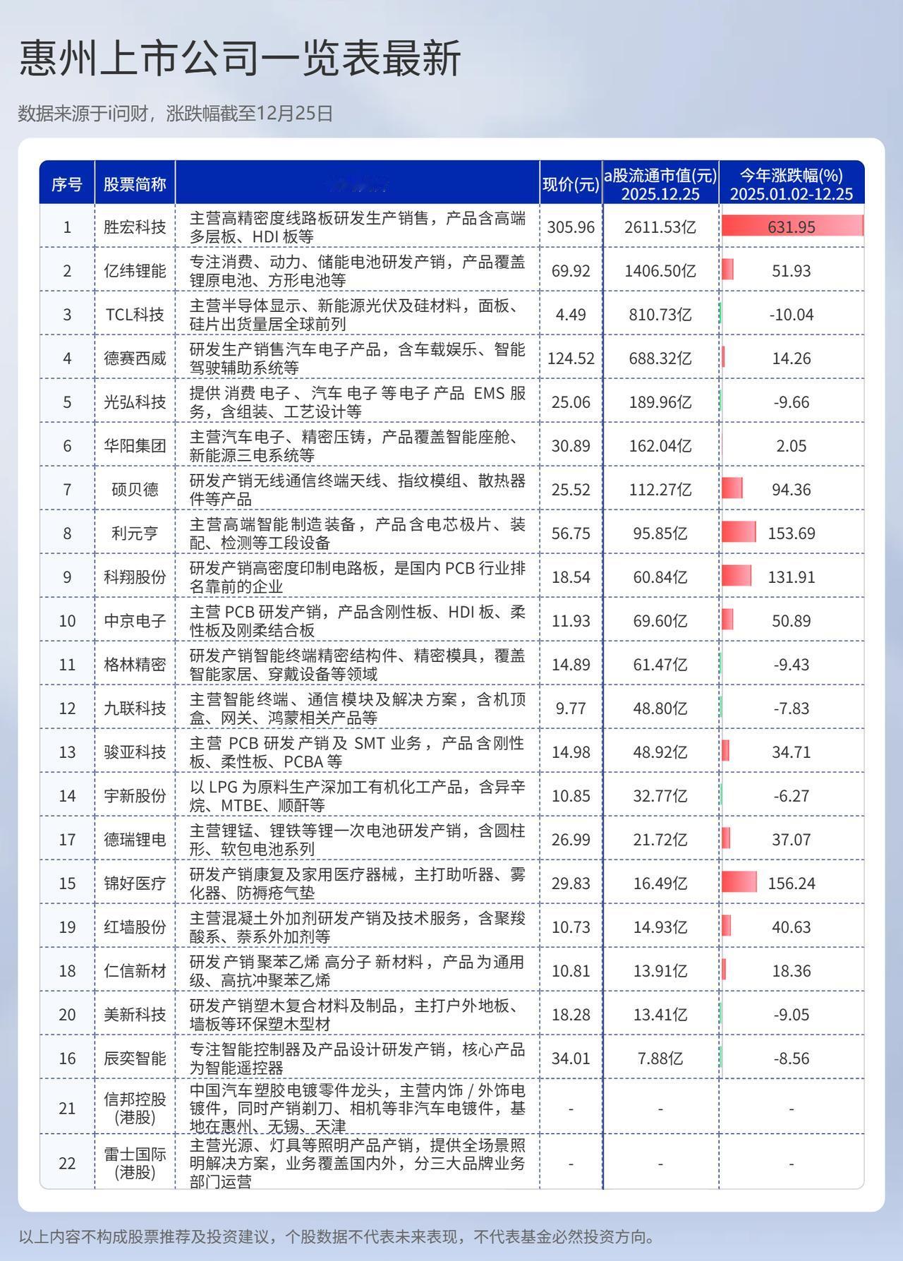 惠州上市公司有多少家?惠州上市公司一览表 (向右滑动图片查看完整名单) 近日,广东省“十五五”规划建议将惠州市列入“经济大市”的行列。 作为以制造业为主的工业城市,这是惠州首次入列广东经济大市,从一个侧面反映了惠州制造业的持续快速发展。 从上市公司情况来看,最新数据显示,广东惠州A股、港美股上市公司共有22家,其中A股市场有20家,港股2家。 从行业分布上,形成以电子信息产业为核心的集群优势。 胜宏科技、德赛西威、硕贝德等10余家企业聚焦电子信息领域,覆盖PCB电路板、汽车电子、智能终端组件等细分赛道,其中胜宏科技以2611.53亿元流通市值居首,成为板块龙头。 从公司流通市值看,呈现“头部企业突出、中小市值企业分散”的特点。 流通市值超千亿的有2家,分别是胜宏科技和亿纬锂能; TCL科技处于500-1000亿区间,这三家构成了市值第一梯队。