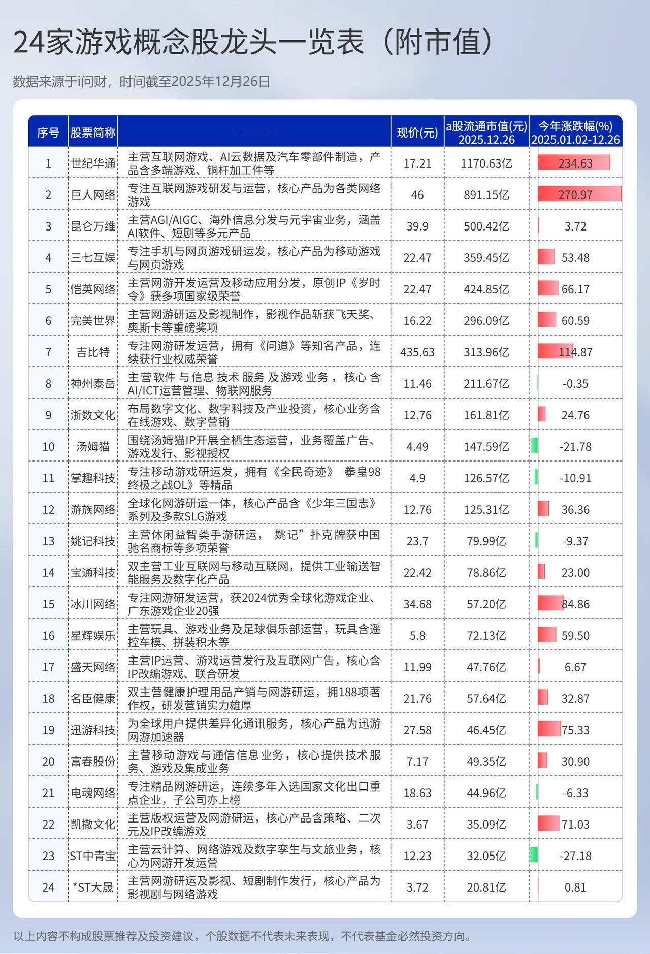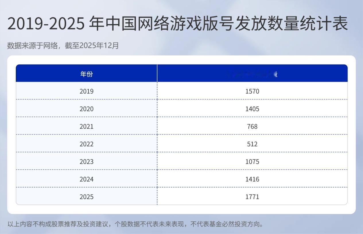 今年国内游戏收入3508亿元!24家游戏股公布 (向右滑动图片查看完整名单) 近期,国家新闻出版署发布了2025年12月国产及进口网络游戏审批结果,当月共有144款国产游戏、3款进口游戏获得版号。 回顾2025年全年,游戏版号发放数量持续回升,累计达1771个,其中国产游戏版号1676个,进口游戏版号95个。 从近年趋势看,版号发放经历阶段性调整后进入恢复通道。 2019年至2022年,版号数量分别为1570个、1405个、768个、512个;2023年起持续回升,发放1075个,2024年增至1416个,2025年进一步放量。 从行业收入来看: 12月19日,中国音像与数字出版协会发布的《2025年中国游戏产业报告》显示,2025年我国游戏市场实际销售收入为3507.89亿元,同比增长7.68%;用户规模达6.83亿,同比增长1.35%。 市场结构方面,增长动力更趋多元。小程序游戏与电竞产品成为国内市场重要增长点,而策略类游戏在海外表现出色,通过“SLG+X”等融合创新,持续推动自研游戏出海收入提升。 有机构分析指出,全球游戏市场仍处于增长周期,未来在营收与用户规模上均有望保持乐观态势。此外,生成式AI等技术有望显著提升游戏开发效率,助力虚拟角色、剧情、地图等内容生成,进一步丰富玩法和付费场景。