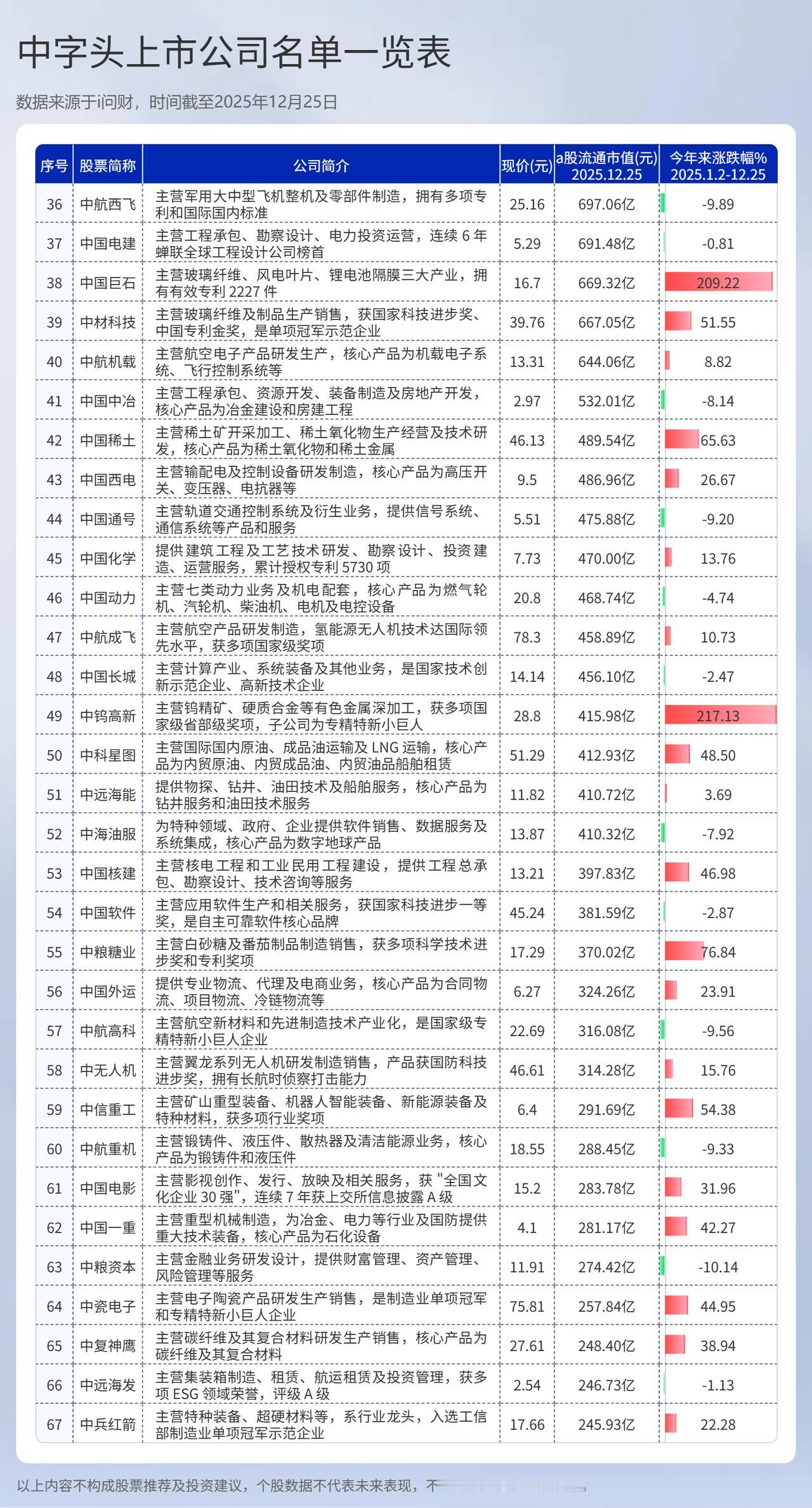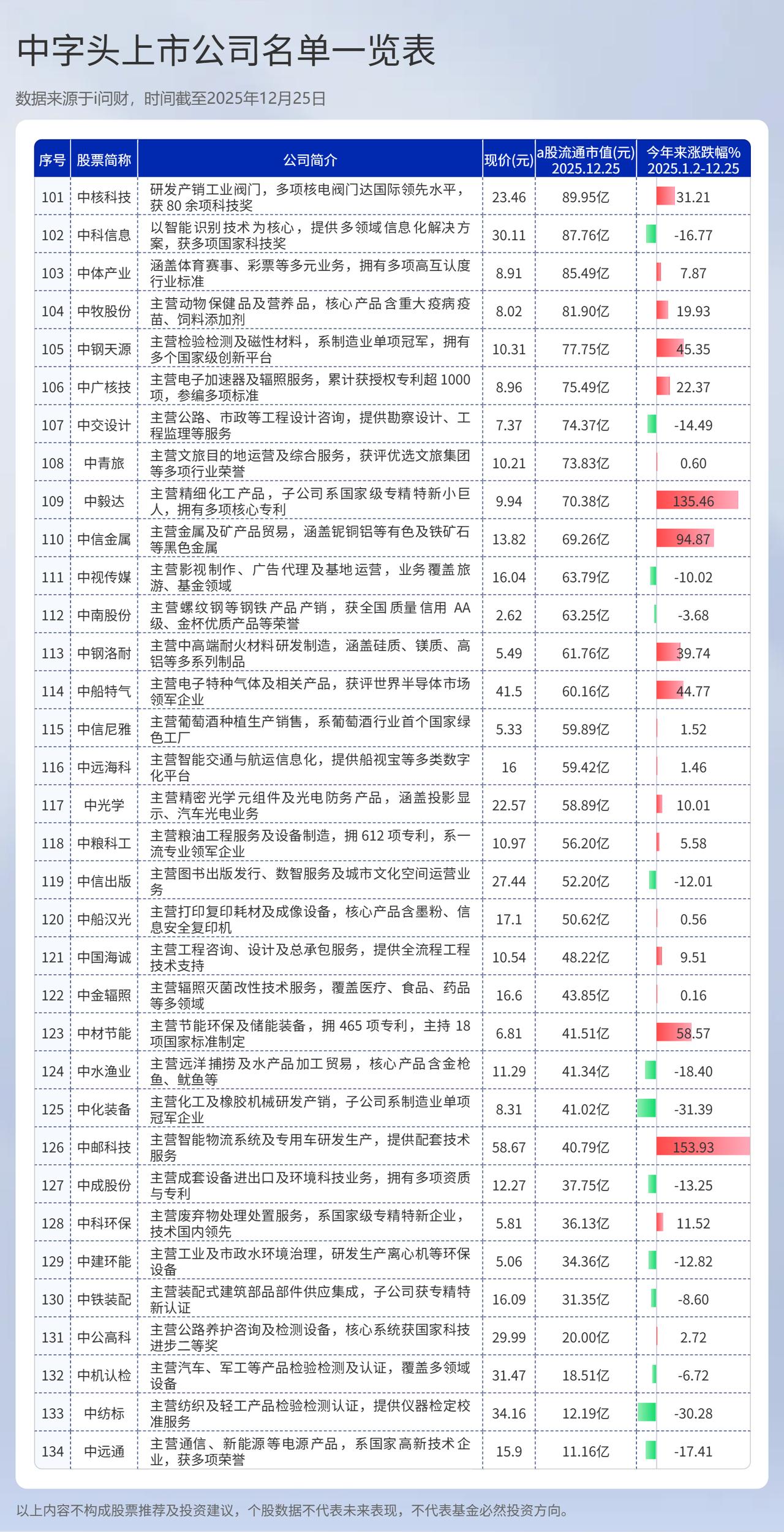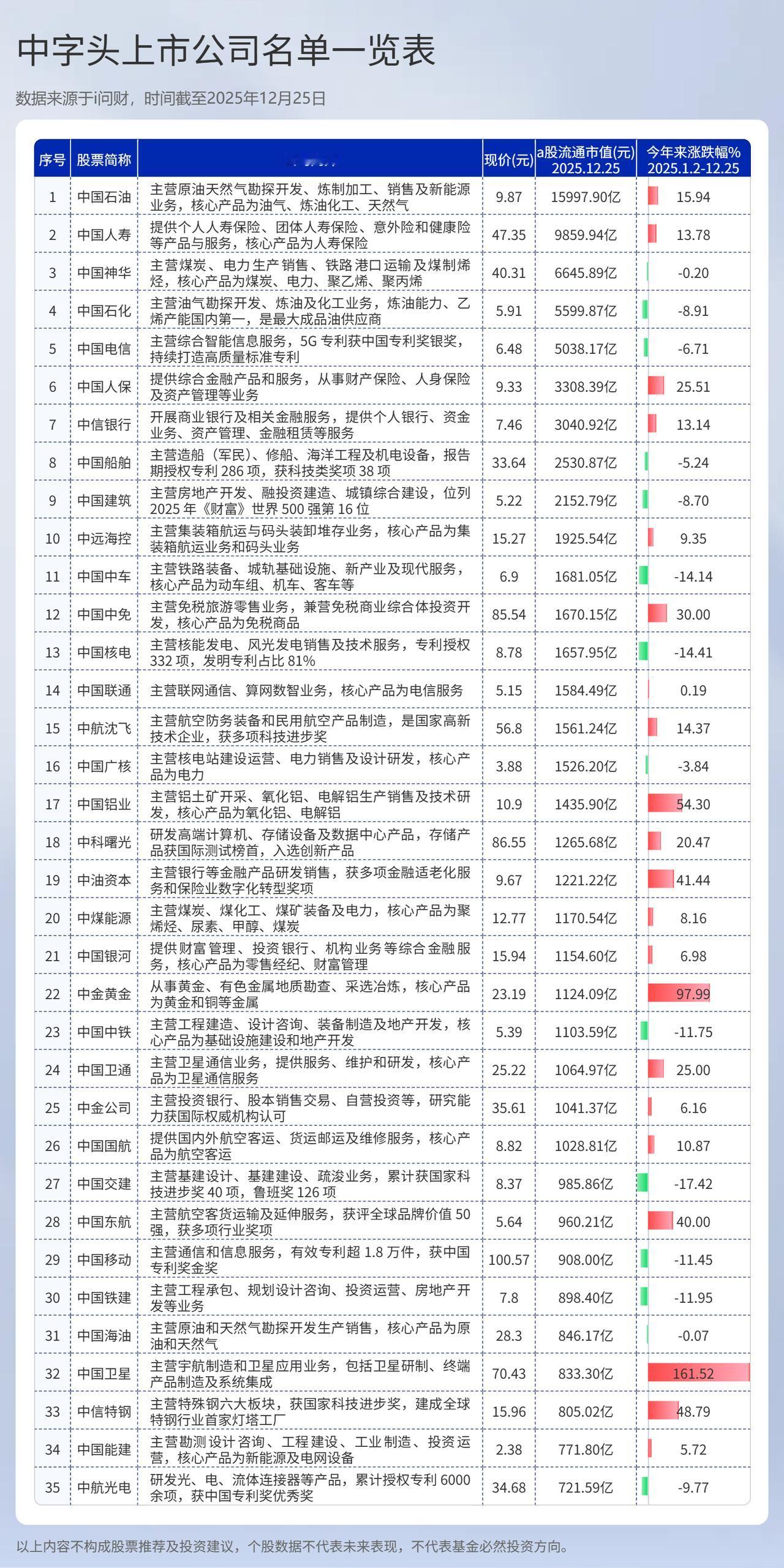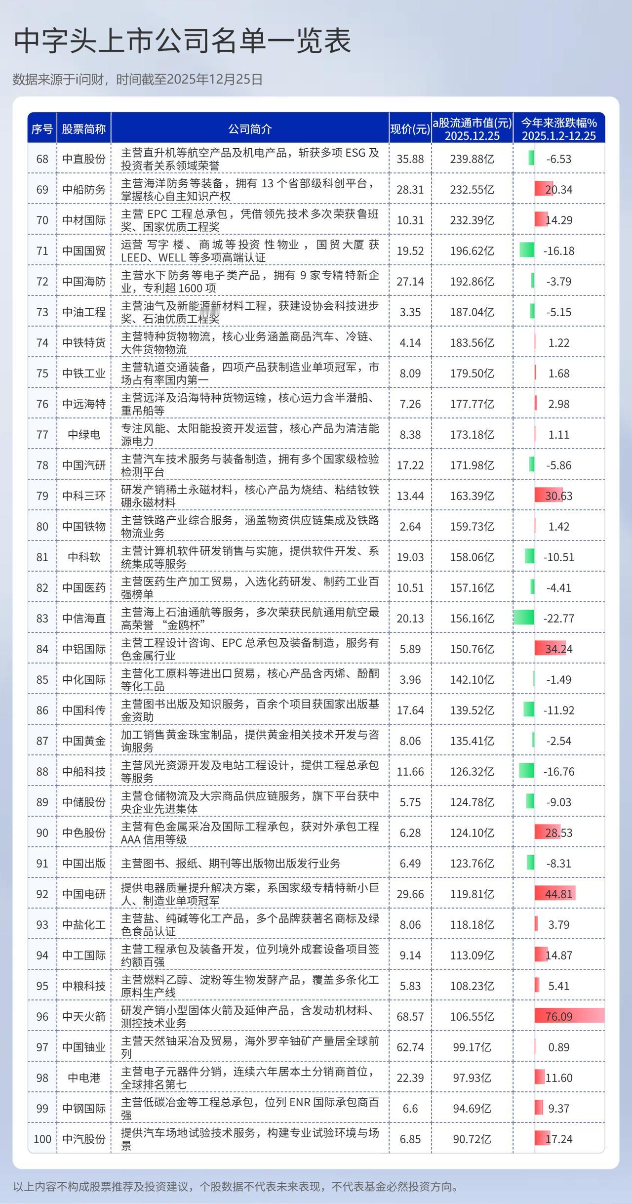 中字头上市公司有哪些?中字头上市公司名单 (向右滑动图片查看完整名单) 中字头上市公司是指名称以“中国”、“中”开头,且实际控制人为国务院国资委或中央部委的上市公司。这类公司多为央企,是国家经济支柱,具有战略性意义。 最新数据显示,截止发稿,中字头上市公司共有134家,从公司2025年股票涨跌幅看,实现年内正收益的仅有71家,占比约53%; 涨幅超过20%的有35家,占比26%。与此同时,跌幅超过10%的公司也达到22家。