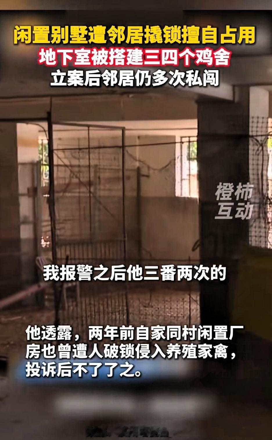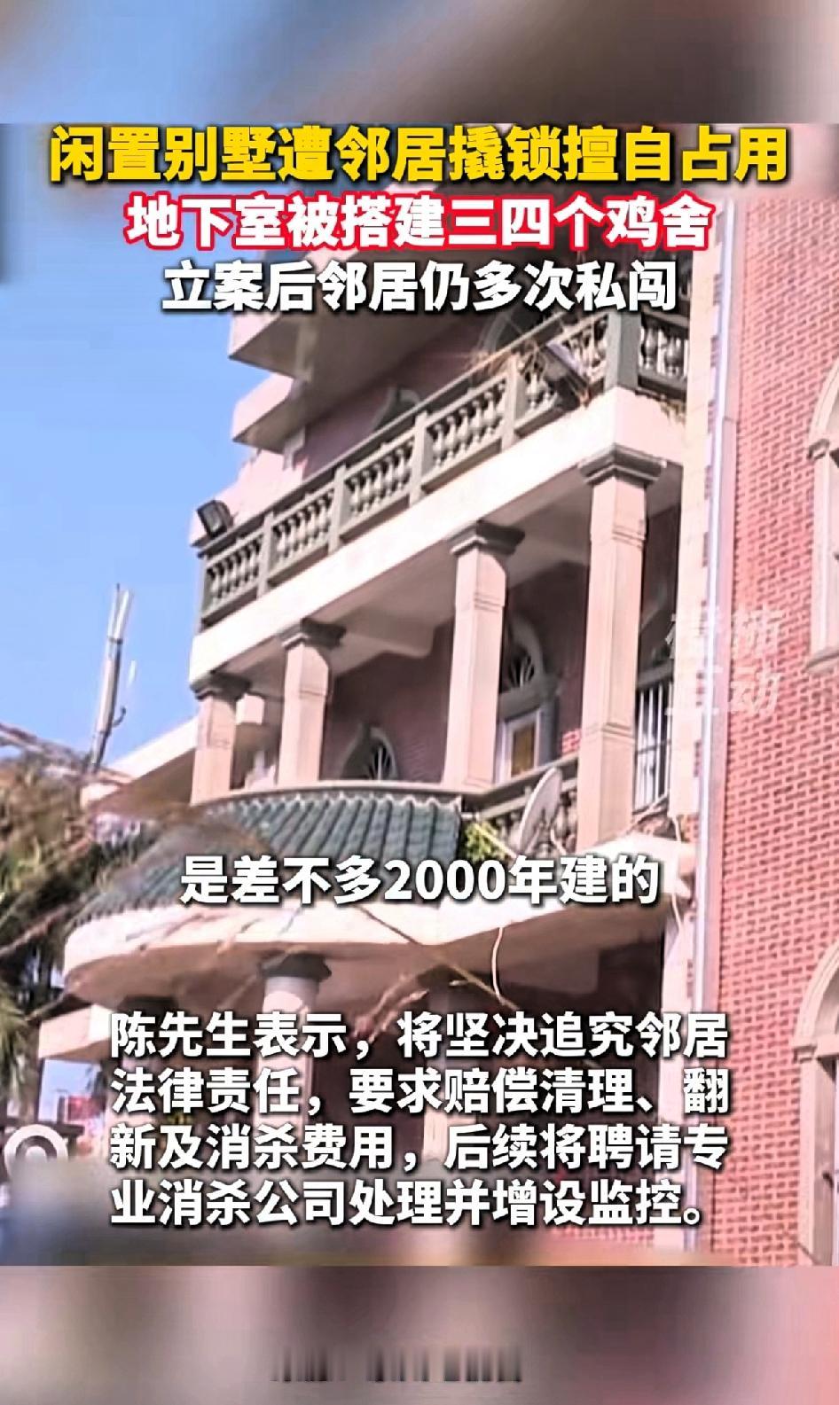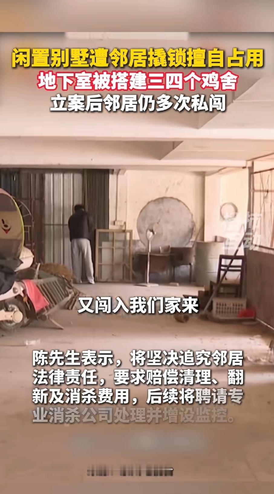 闲置别墅遭邻居撬锁擅自占用,地下室被搭建三四个鸡舍,报警立案后仍被邻居多次私闯。 福建泉州陈先生可太倒霉了!他2000年前后建的别墅,光装修都花了4-5百万,闲置后竟被隔壁邻居盯上。 今年冬至他回老家祭祖,没想到推开别墅门,一股刺鼻臭味扑面而来,地下室还传来鸡叫。 下去一看,地下室被搭了三四个鸡舍,养着四五十只鸡鸭,地面和墙壁满是粪便污渍。 陈先生赶紧报警,民警让他加把新锁保留证据。可第二天,鸡鸭全没了,旁边储藏间也被占,门锁被换。 邻居也知道陈先生报警,不但不主动道歉协商解决问题,还趁房主不在家时,又偷摸进入地下室把鸡鸭全部移走。这样的行为,真是胆大妄为,不把法律放在眼里。 到了第三天,里面的工具等物品又被搬空,警察都立案了,对方还敢这么干。 陈先生没想到对方这样大胆,在立案后,邻居还试图毁灭证据吗?真是无法无天!陈先生决定走法律程序,坚决追究邻居,要求清理赔偿、翻新消杀费用。 而且这不是他第一次遇到,两年前老厂房就被同村人撬锁养家禽,最后不了了之,如果第一次遇见这种事坚持追责,后续邻居也不敢再有这种行为。 邻居之所以这么大胆,就是看准了房主不在家,即使被发现后,看在都是邻居的份上,觉得房主不会追究责任,才敢一而再再而三的多次闯入。 房主陈先生表示,后续也会安装监控,随时可以看到老宅的情况,避免此类事情再次发生。