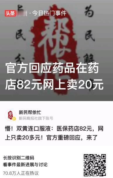 “触目惊心!”上海,一女子花费82块钱,在某医保药店买了一盒药,结果她竟然发现,这款药在网上却只卖20多块钱!女子很纳闷,于是就将此事反映给了媒体,可结果却让她目瞪口呆! 上海的宋女士遇到件糟心事,让她越想越纳闷,前段时间,她在闵行区龙柏一村的一家医保定点零售药店,用医保卡买了一盒双黄连口服液,结账时花了82元。 本来没太在意,结果后来刷手机时偶然发现,同款药在网上卖得便宜太多,一下子就愣住了。 宋女士买的这款药,厂家是河南太龙药业,规格是20毫升×10支,她在美团买药、天猫等互联网平台上看到,同厂同规格的双黄连口服液,售价普遍在27元到30元之间,有的甚至更便宜,算下来网上价格还不到药店售价的三分之一。 这巨大的价差让她很困惑,都是一样的药,还是医保目录里的品种,怎么线上线下差这么多? 其实不光宋女士遇到的这款药,不少人可能都有过类似感受,总觉得刷医保买药好像没比自费便宜多少,甚至有时候更贵。 带着宋女士的疑问去了解了下,才发现这里面有不少门道。 首先得说清楚,宋女士买药的这家药店,82元的售价其实没违规,有记者查过,另一家大型连锁药店同款药售价更是达到91元,按照上海的相关规定,零售药店可以在集采平台药品价格基础上加价一定比例销售,这两家的定价都在合理范围之内。 那为什么线上线下价差这么大呢? 说白了,还是运营模式和成本不一样,线下的医保定点药店是盈利性商业机构,要承担房租、人工、水电这些实打实的成本,而且采购药品有自主权但渠道相对固定,价格受医保部门监管但有上浮空间。 反观互联网药店,没有实体店面的租金压力,采购渠道更灵活,还经常会有平台补贴搞促销,用低价吸引流量,自然价格就降下来了。 有人可能会问,医保目录里的药,就没有更合理的参考价吗? 宋女士当时也这么纳闷,后来有人建议她登录随申办市民云App查询医院药品采购价,结果发现近30天内没有她买的这个规格的采购记录,但同厂家其他规格的可以参考。 比如10毫升×6支的采购价是25元,10毫升×12支的是50元,按这个折算下来,200毫升的20毫升×10支规格卖82元,从定价规则上看确实说得通。 不过宋女士的困惑也说出了很多人的心声,就算定价合规,医保药店的价格能不能再亲民点? 让人欣慰的是,相关部门已经给出了回应,这款双黄连口服液已经被纳入上海中成药带量采购目录,预计很快就会执行新的“对折”价格,到时候价格会明显降下来。 更值得期待的是,医保局也在抓紧研究把互联网药店纳入医保支付的范畴,要是以后线上买药也能刷医保,大家就能既享受低价又方便快捷了。 其实线上线下药价有差异是正常现象,毕竟各自的运营成本摆在那,但对于消费者来说,最关心的还是能不能买到性价比高的药,尤其是需要长期用药的人,价格差异带来的影响可不校建议大家买药前多留意下不同渠道的价格,要是不急用,线上价格合适的话可以多对比选择;如果急需用药,线下药店的便利性还是没法替代的。 随着带量采购的推进和医保政策的不断完善,相信以后药品价格会越来越透明合理。 不知道大家有没有遇到过类似的买药价差问题?对于医保药店和网上药店的价格差异,你有什么看法?欢迎在评论区留言讨论! 对此您有什么不同的看法,可以在评论区留言讨论!!! (消息来源:新民帮侬忙)
