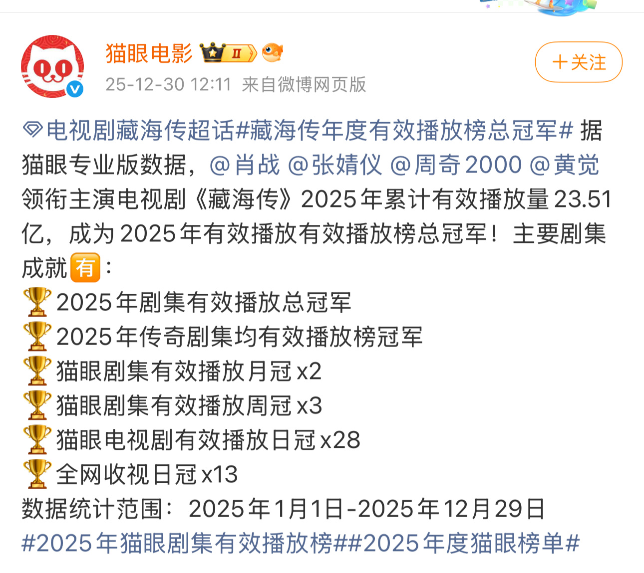 藏海传年度有效播放榜总冠军藏海传又一个来自官方的年冠榜单! 2025剧王!👑 2025剧集热度总冠2025剧集有效播放总冠