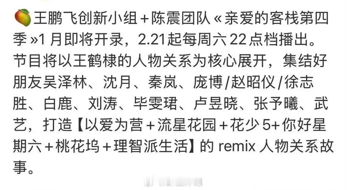 《亲爱的客栈》开录先导片了,芒果又给王鹤棣组了个综艺熟人局