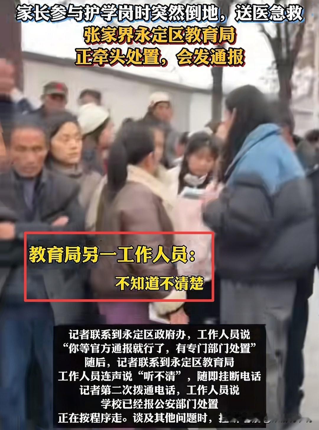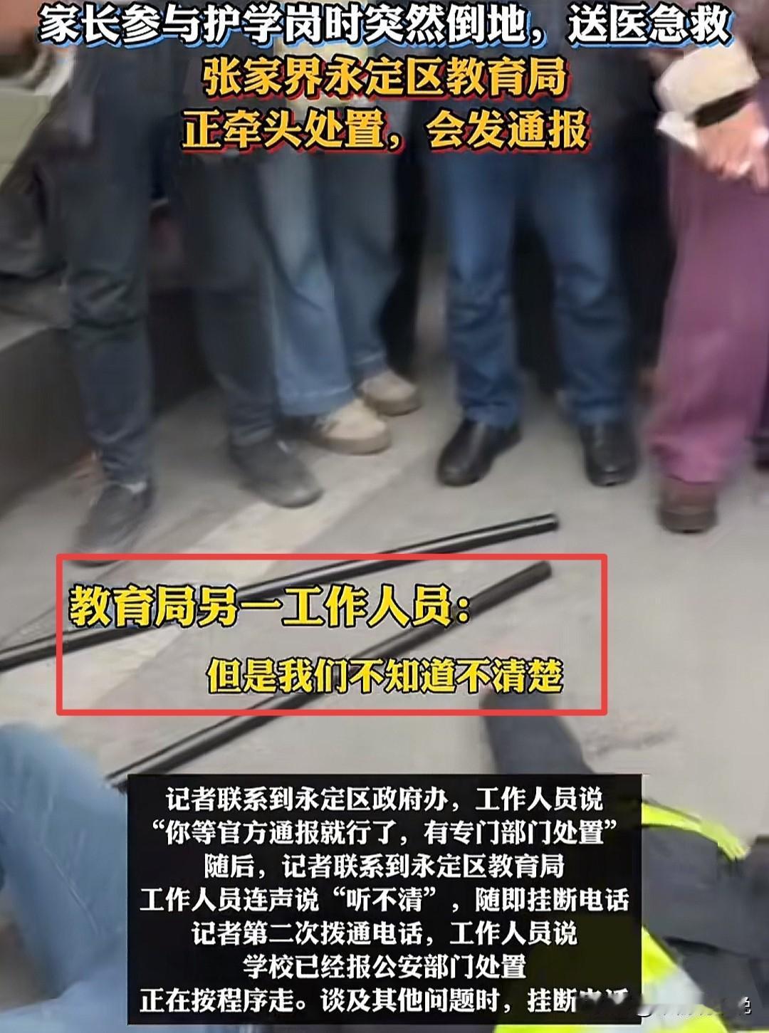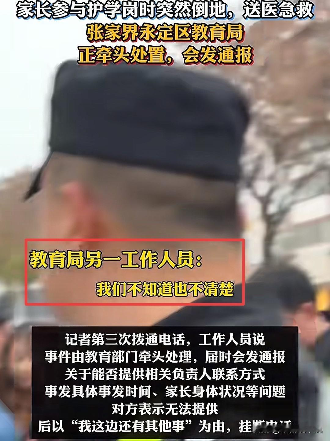 家长参与护学岗身亡已经令人痛心了 但这件令人痛心的事件背后 还有着更让人心寒的一幕,那就是当地教育局对生命的漠视回应! 事情发生后,有记者采访教育局的工作人员,询问目前这个事情是哪个部门在牵头处理?一位男性工作者回复说就是我们教育局相关的部门在处理,并表示具体情况到时候会出通报的! 而另外一位女性工作者回复的就更有意思了,她说“我们真的不清楚不知道,如果我们知道、清楚会给你说的,但是我们不知道、不清楚!不知道!不清楚!不知道!不清楚!我们不知道!也不清楚……” 事发突然,教育局暂时不清楚是可以理解的,但这一定不是一位教育工作者应有的回复方式和态度,教育行业是一个有温度的行业,这位女士也非常敬业,因为她的普通话很标准、很流利,也很冷漠!