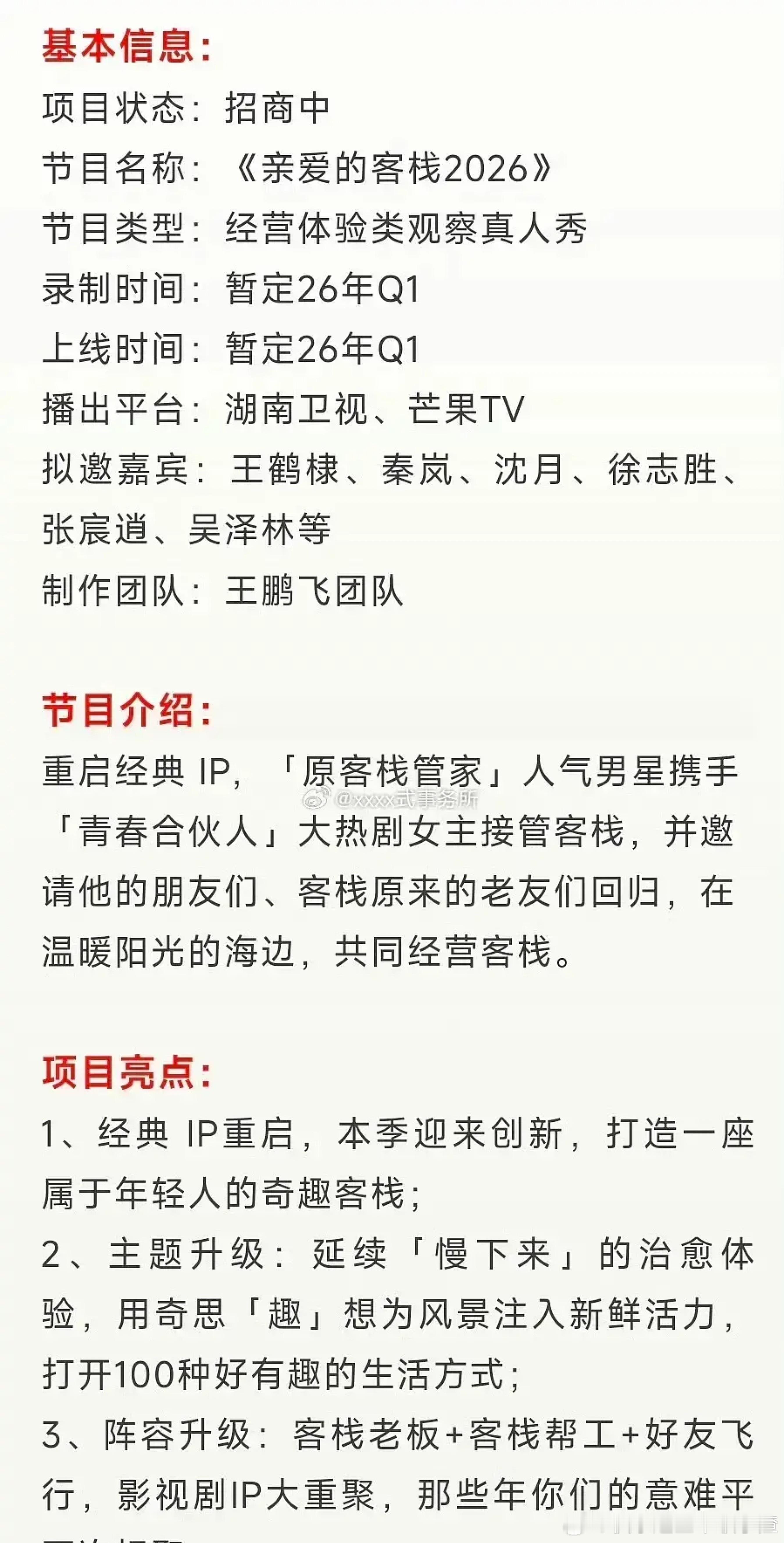 《亲爱的客栈2026》目前在海南开录先导片,1月底正式开拍,连拍2周,拍完过年🧨阵容🈶:客栈老板王鹤棣➕秦岚【理智派生活】➕沈月【流星花园】➕吴泽林【好六同事】➕徐志胜【桃花坞同事】➕张宸逍【萌样影视】➕王鹤棣合作过的其他女主和同事当嘉宾。