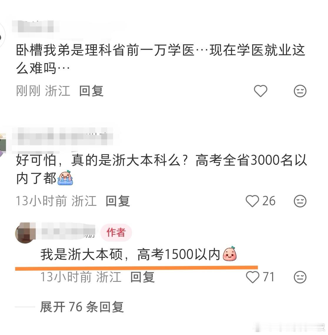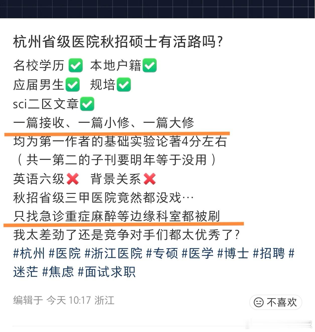 浙大本硕,规培专硕,高考前1500名。SCI二区,只找边缘科室。加油,小伙子!