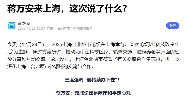 蒋万安在上海24小时,一口饭都不敢多吃!一步都不敢多留!早上刚到立马参加双城论坛的主要活动,傍晚就急着往回赶,官方理由是“坐镇台北”处理公务。 上海和台北从2010年起举办双城论坛,累计签署47项合作备忘录,涵盖水治理、职业培训、动物保育、科技医疗等领域,这些实打实的项目,直接惠及两市民众。 上海方面始终敞开大门,支持交流的态度一贯明确,甚至在论坛延宕多次后,仍积极协调,让活动最终落地。 这份诚意,是基于两岸同胞血脉相连的共识,是为了让民众多走动、多受益,可蒋万安这边呢? 行程一再压缩,从最初可能的参访医院、文化中心、动物园,到夜间体验滨江夜经济,全都取消,只剩主论坛半天。 他本人也承认“来去匆匆,有些遗憾”,连上海美食都没时间品尝,这既有台北捷运随机杀人案的突发公务原因,也有岛内政治压力下的无奈退让。 岛内民进党当局从一开始就层层设卡,今年论坛原定9月举办,却因陆委会和相关部会对备忘录内容挑刺,一拖再拖到12月28日举办。 台北市民调显示,71.3%的民众认为两岸关系越紧张越需要交流,64.1%的民众支持持续举办双城论坛,可当局却不顾民意,处处限制,甚至修订法规压缩地方赴陆空间。 蒋万安作为台北市长,本该为市民争取更多福祉,却在这种环境下,只能选择“当天往返”来规避风险。 表面上是因应台北捷运随机杀人案坐镇指挥,实质上也有怕被贴上标签,影响未来政治布局的考量。 岛内国民党内有人直言,这无疑是政治干扰的结果,双城论坛本该是常态化平台,现在却成了得来不易的“突破”。 蒋万安反复强调“接触比抵触好,对话比对抗好,了解比误解好,互动比冲突好”,并盼望“双城好,两岸好”,这些话听起来温和务实,也确实反映了许多两岸民众的共同心声。 可问题在于,他始终将交流局限在市政层面,避免触及更深层的政治基础。 蒋家后代的本份,本该承载历史责任,推动两岸真正和解,可他却小心翼翼,刻意低调,甚至在岛内压力下缩短行程。这不是担当,而是妥协。 两岸关系要和平发展,离不开一个中国原则的共识,大陆方面多次重申,支持交流的前提是坚持九二共识、反对台独。 蒋万安回避这些底线,只谈民生合作,终究是治标不治本,无法为台海注入持久稳定力量。 双城论坛保留了两岸少数城市交流管道,让民众看到和平可能的曙光,可蒋万安的“镣铐式”访问,也让人遗憾,他带着蒋家血统,却没有展现出应有的历史担当。 祖上在两岸关系中留下的复杂遗产,本是桥梁,却在他这里成了包袱,他对两岸统一态度模糊,未明确反对统一,仅强调维持两岸市政交流的分治现状,却又想借交流捞取政治资本,这是一种典型的岛内政客算计。 国民党骨子里那种对两岸统一的模糊态度,在他身上体现得淋漓尽致,论坛结束次日,大陆就宣布军演,这不是针对个人,而是对台独势力的坚决回应。 蒋万安返台后谴责“升高冲突”,但根源在于民进党当局的挑衅,他却不敢直面指摘,只会两边讨好。 你认为蒋万安这次“快闪”上海,是无奈之举,还是缺乏勇气? 信息来源:直新闻 蒋万安来上海,这次说了什么?