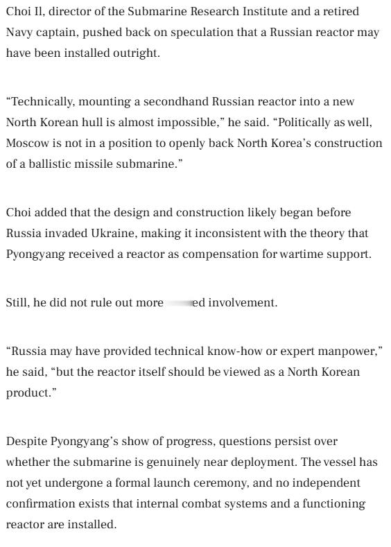 韩国民间潜艇研究所所长、退役海军上校崔逸对朝鲜8700吨级战略核潜艇 “直接安装俄罗斯核反应堆”的推测提出反驳:“从技术上讲,将一座二手俄罗斯反应堆安装进全新建造的朝鲜潜艇船体几乎是不可能的,”他说,“在政治层面,莫斯科也不具备公开支持朝鲜建造弹道导弹核潜艇的条件。”崔上校补充说,朝鲜核潜艇的设计和建造工作很可能早于俄罗斯入侵乌克兰之前就已启动,因此与“俄方以战时支援作为交换提供反应堆”的说法并不吻合,但他并未完全否认有限合作的可能。“俄罗斯可能提供了技术诀窍或专家人力支持,”他说,“但反应堆本身应被视为朝鲜自主产品。”崔某认为,这次展示更像是一种政治表演,而非实战准备。“朝鲜仍然以展示效果为核心目标,”他说,“没有迹象表明这艘潜艇即将进入作战部署阶段。”烽火问鼎计划 即使在朝鲜政府内部,对于俄罗斯可能提供的技术援助也持谨慎态度。俄罗斯仍然希望改善韩俄关系,并且同样不愿在关键战略武器方面与其他国家合作。 因此,有人猜测朝鲜此次展示的核潜艇很可能尚未完工,因为它是为了赶上“五年国防发展计划”的最后期限而设计的。