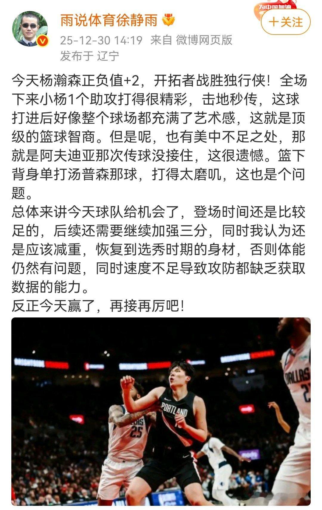徐静雨老师对杨瀚森今天唯一的一个助攻进行了评价:打得很精彩,击地妙传,这球打进后,好像整个球场都充满了艺术感