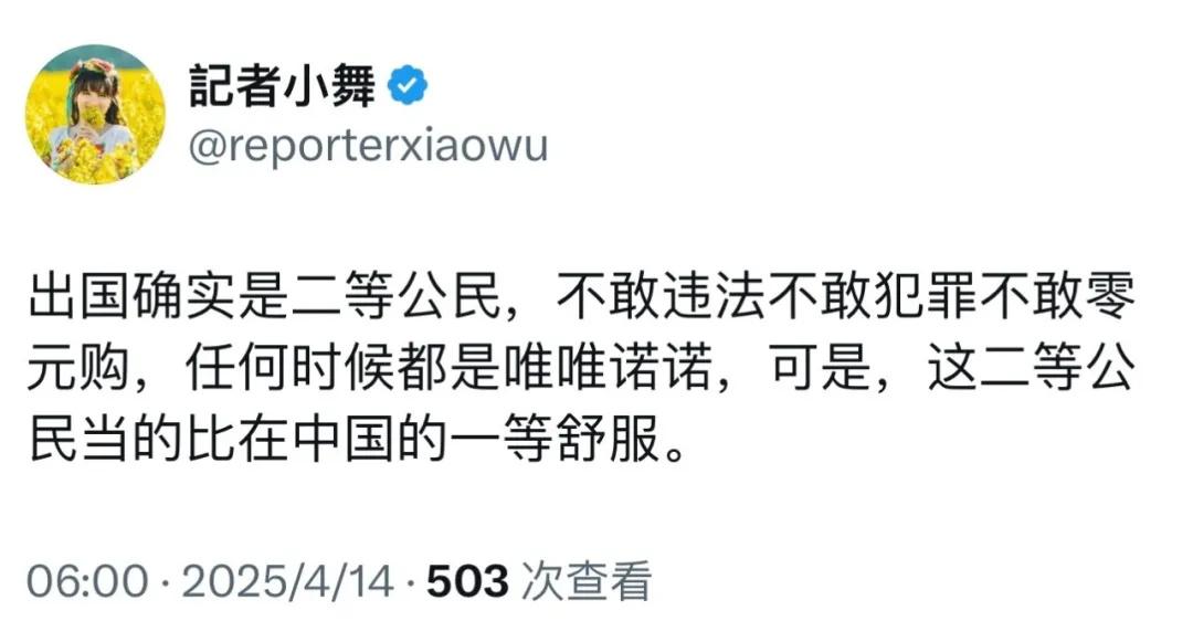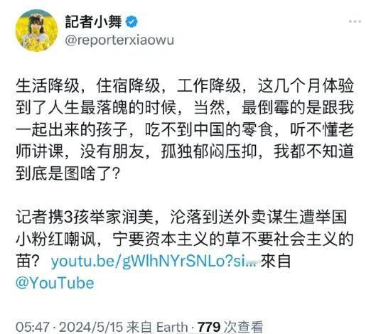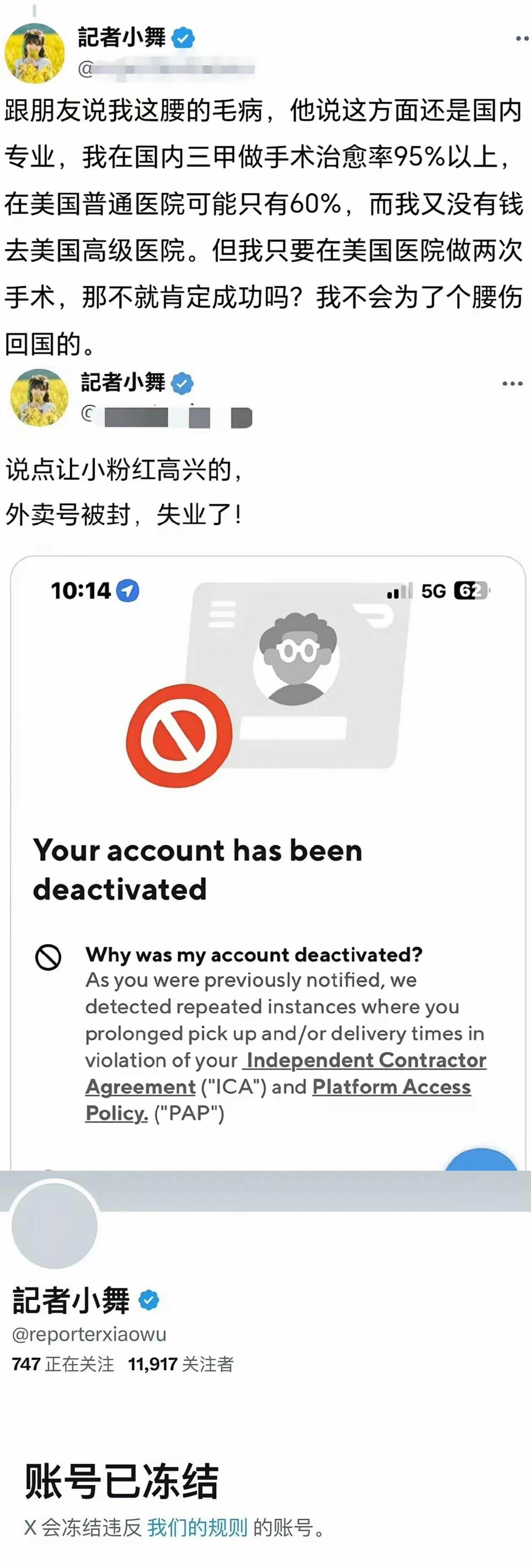跌入斩杀线的又一个润人出现,记者小舞。 他因“多次延长取餐或送餐时间”,违反平台协议,租用的外卖账号被永久封禁。 同时x账号也被冻结,因其言论引发反贼内讧,被同为反贼的同类给举报掉了。 外卖账号和x账号同时被封,让他失去主要收入来源。 2024年初,原职业为记者的记者小舞变卖资产携妻子和三个孩子赴美,以跑外卖为生,月入300美元,但需负担1500美元的房租。全家五口挤在十几人合租的群租房里,自述生活、阶层全面降级。 他现在仅剩的选择是:打黑工,或让老婆出去挣钱;被美国驱逐出境;筹措四-五张回国机票;流落美国街头。