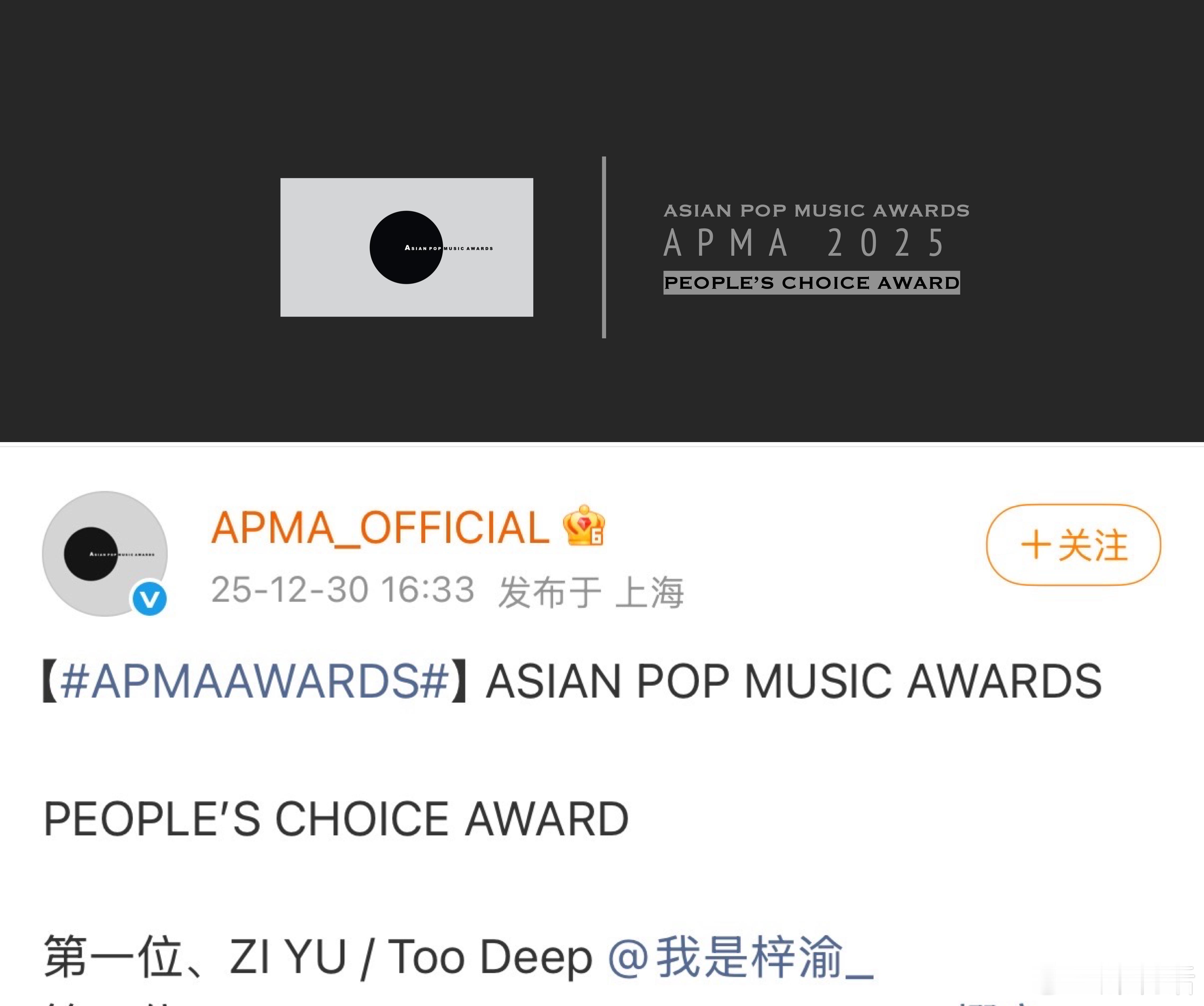 恭喜梓渝凭借原唱歌曲《too deep》拿下亚洲流行音乐大奖PEOPLE’S CHOICE AWARD第一名✌🏻实力人气音乐人实至名归