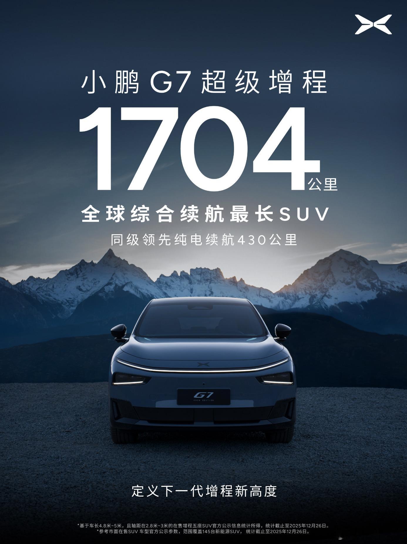 小鹏G7 增程版,55.8度电池包+60L油箱,纯电续航430km,综合续航1704km