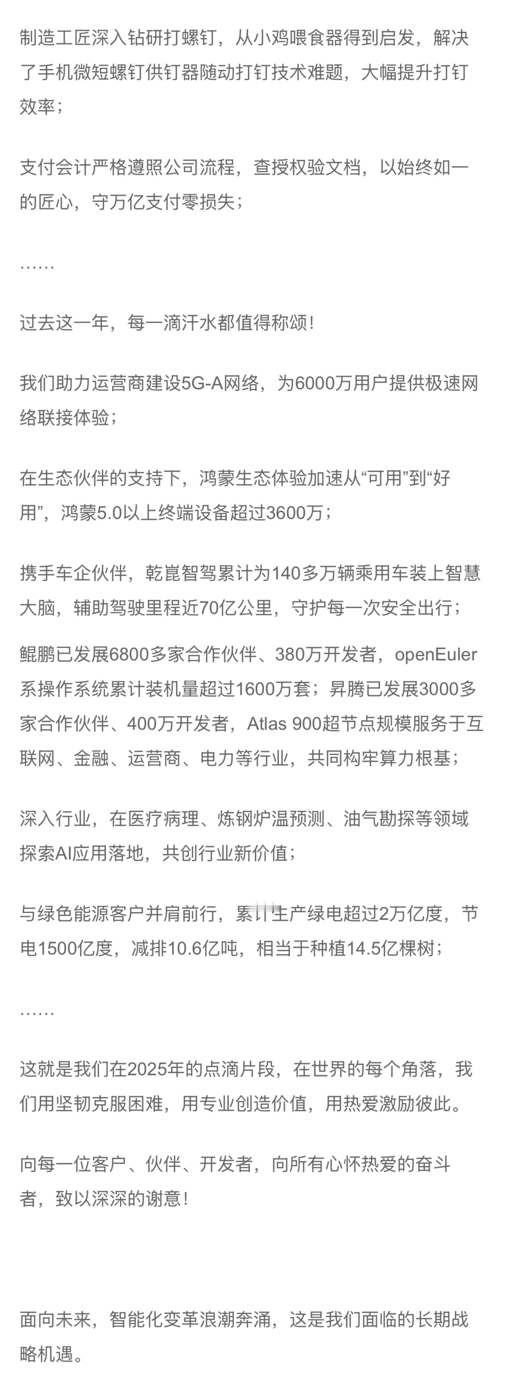孟晚舟新年致辞谈华为2026战略看到孟晚舟总说撒哈拉44℃高温里穿梭的网优工程师,突然想起去年夏天去西北戈壁边上的小镇,居然能流畅刷直播——当地人说前两年这地方连电话都时断时续,是华为的工程师跑了好几趟才把基站建稳。那时候只觉得“信号好”是件平常事,现在才知道是有人在红土飞扬里捋清了网络症结。现在我用的5G-A网络,刷大文件、连视频会基本不卡,原来这是6000万用户都在享的体验。看到致辞里说2026要把“智联”做深,还挺期待老家县城的5G能再稳点,过年回家能和在城市里一样。