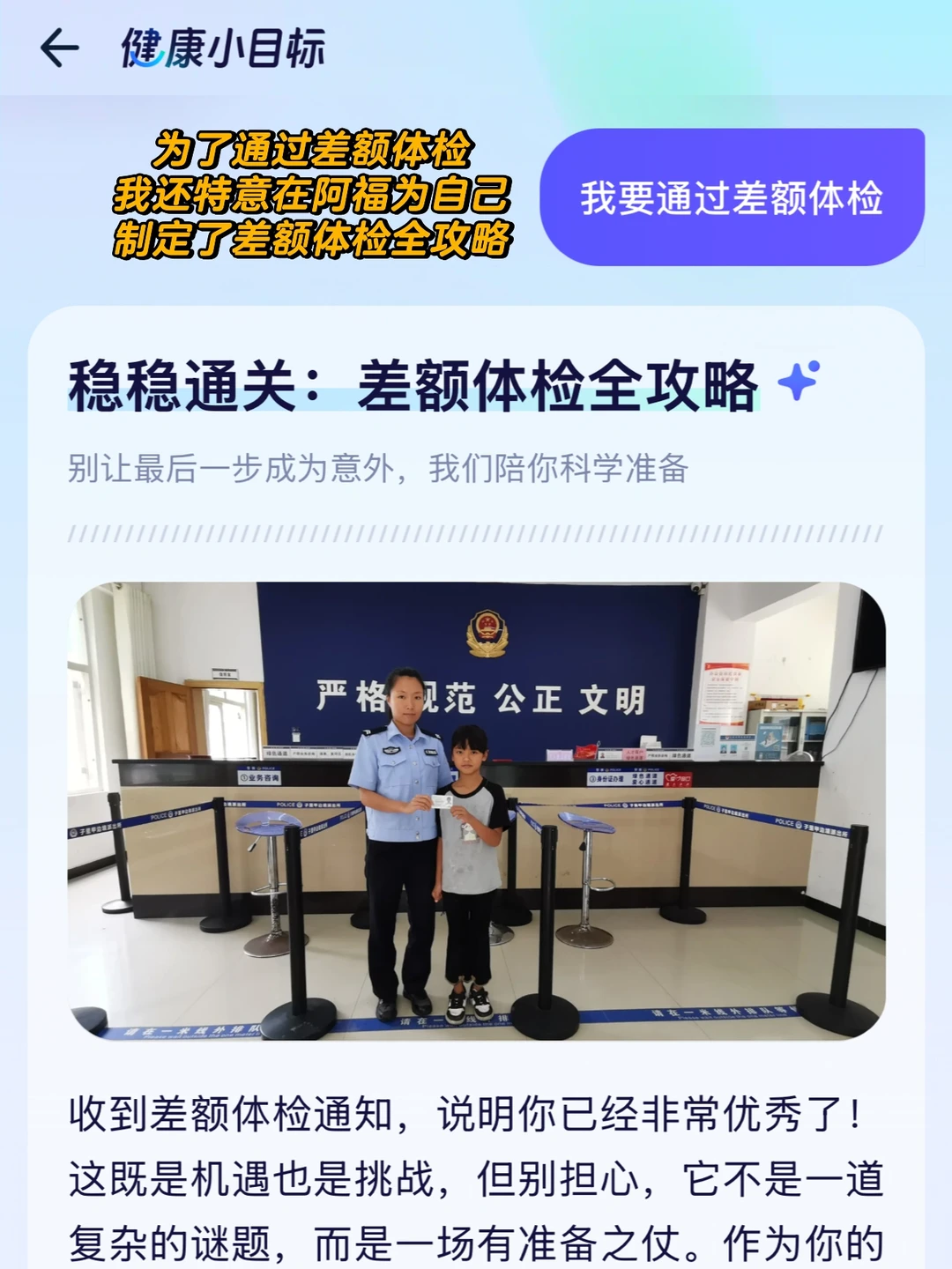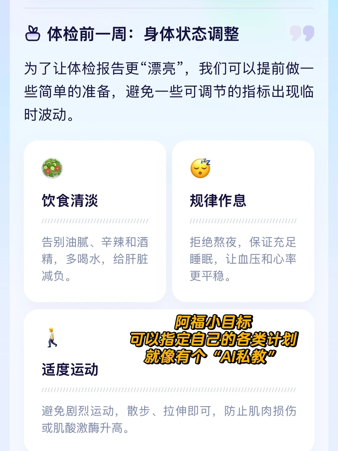 备战期间,我简直把它当成了私教。阿福制定了一份我的差额体检建议;一周前、一天前、当天应该如何应对,保证充足睡眠,别紧张!这种随时随地、有问必答的感觉,真的太踏实了!就像带了一个专家朋友在身边。✨
