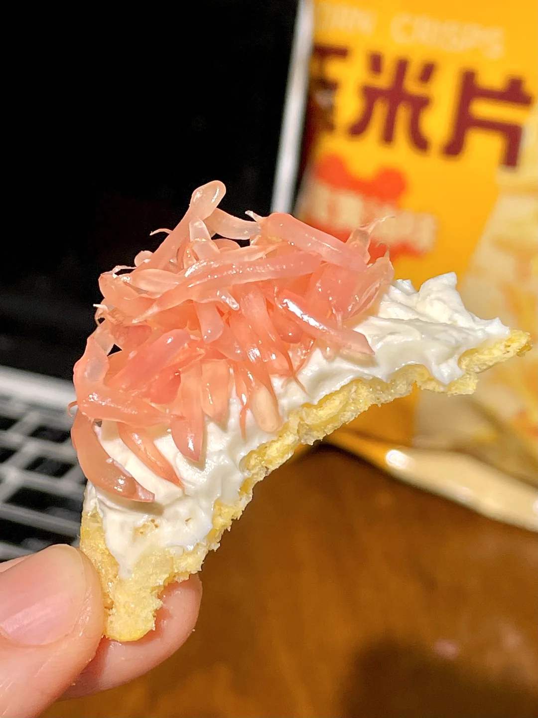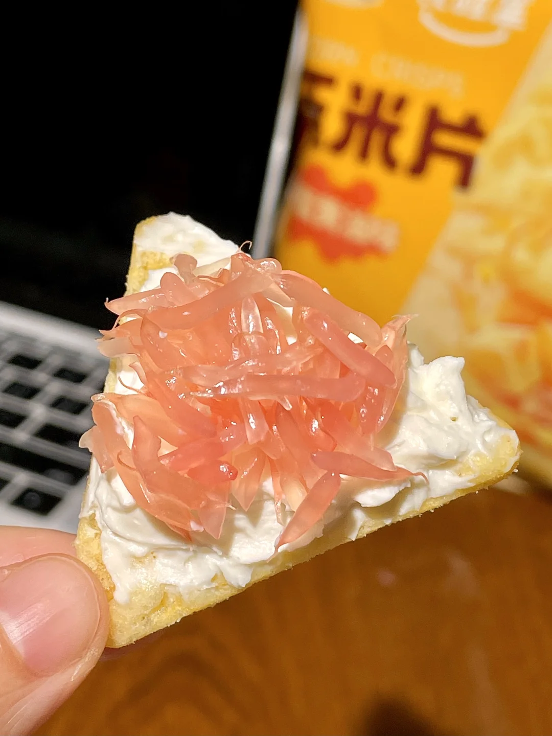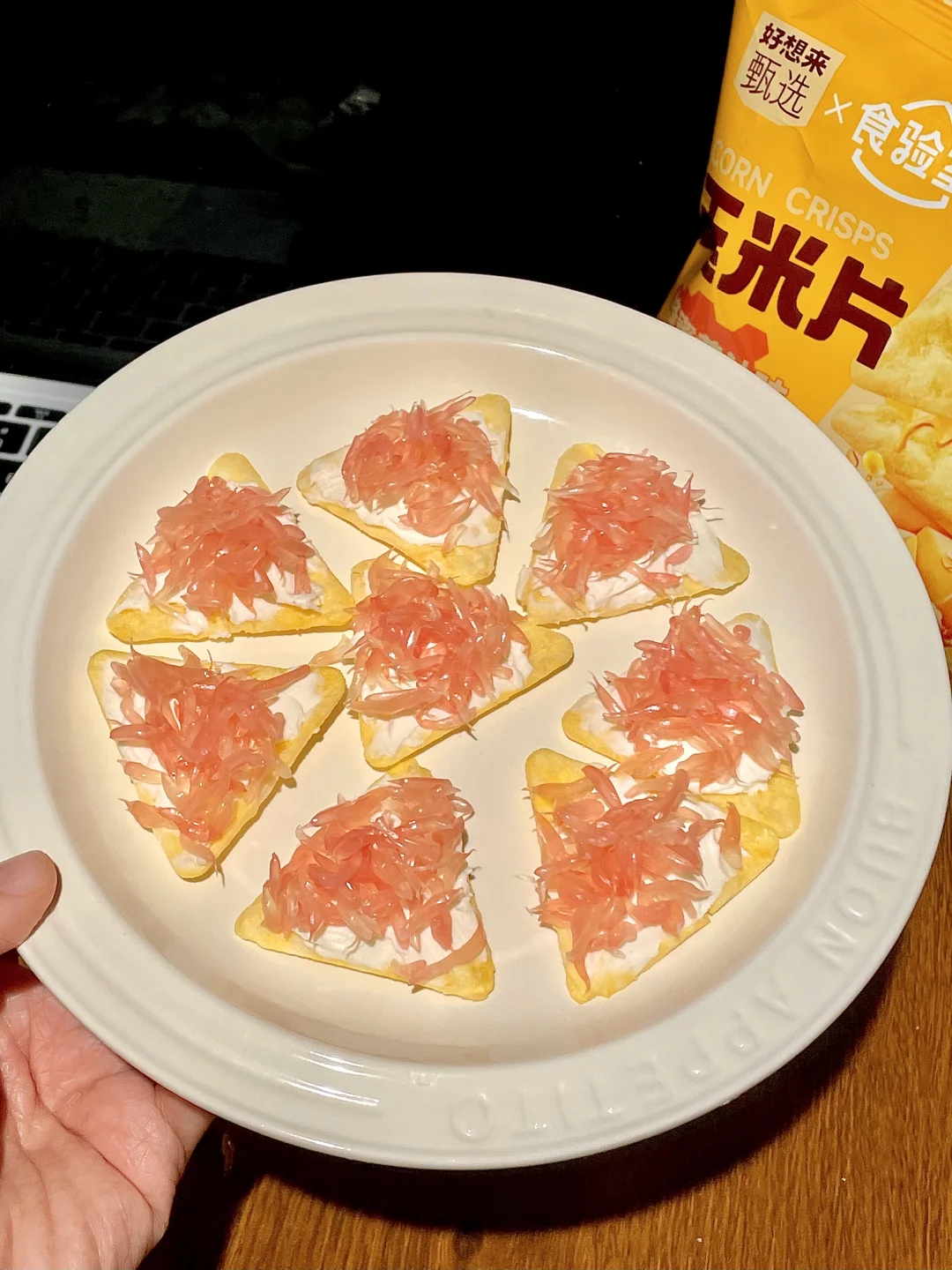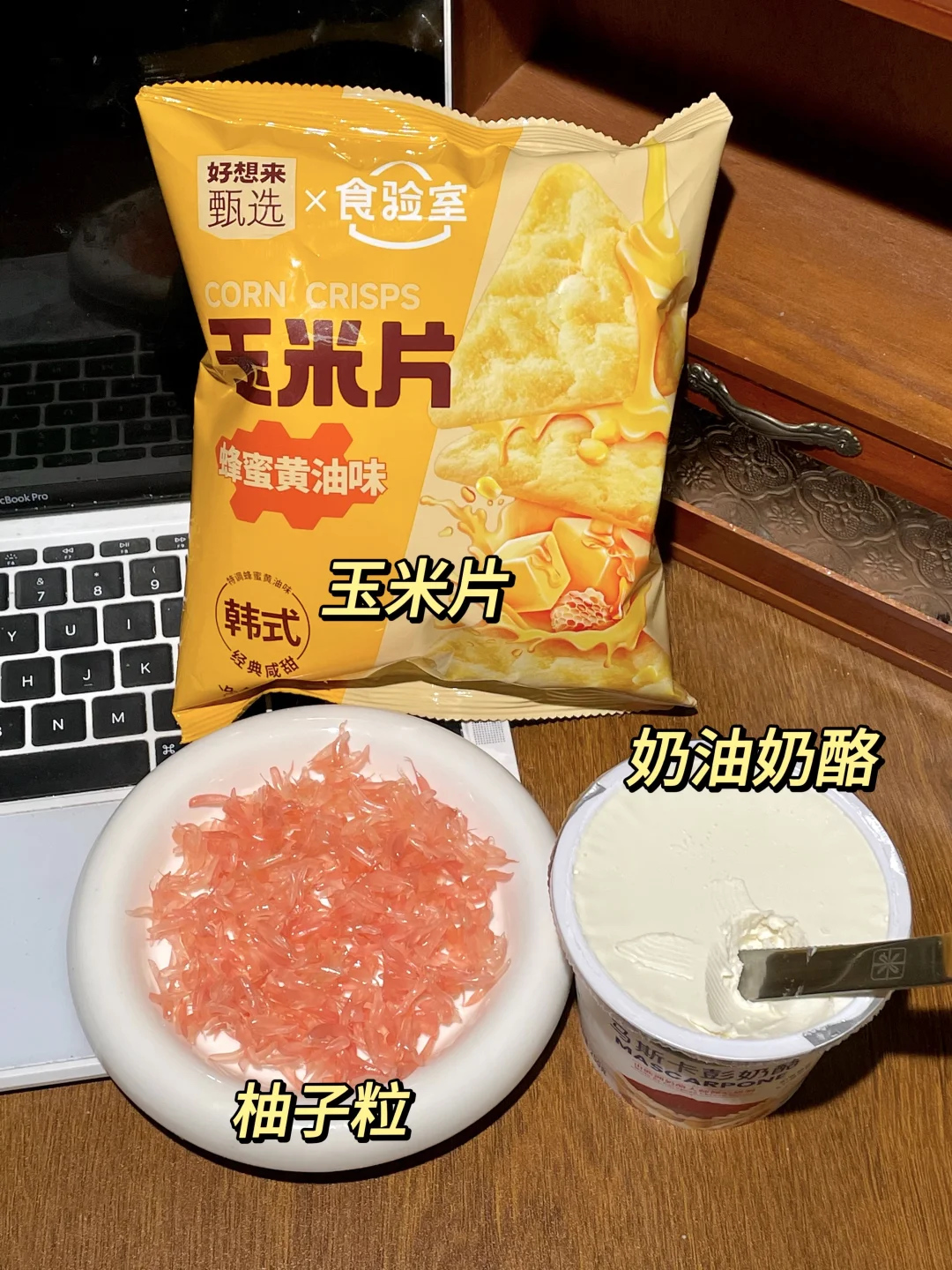 玉米片+奶油奶酪+柚子粒 很简单的搭配,但出乎意料的好吃👅!!