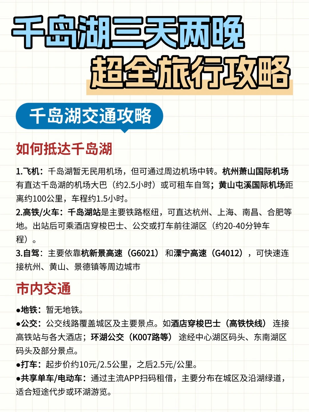高铁到「千岛湖站」,出站坐酒店穿梭巴士或打车;市区建议骑行或公交,景点之间打车也很方便