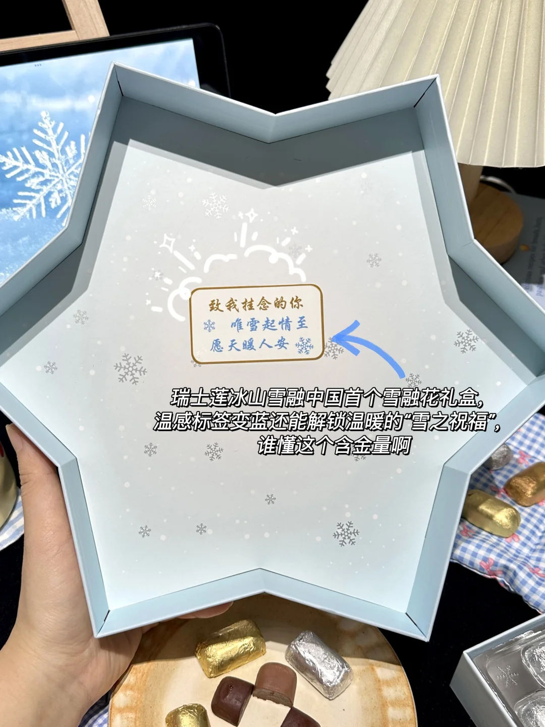 而且这个礼盒是瑞士莲冰山雪融中国首个雪融花礼盒,温感标签变蓝还能解锁温暖的“雪之祝福”,谁懂这个含金量啊!新年和情人节送礼走心又体面!
