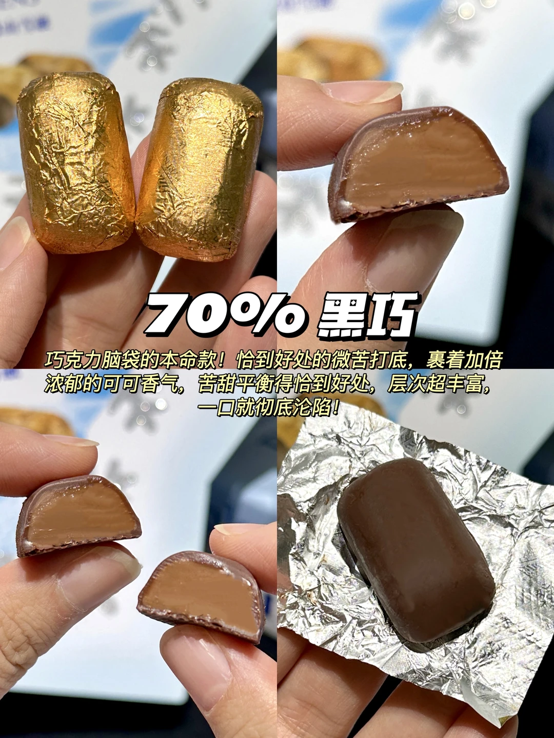 🍫70% 黑巧:本是巧克力脑袋的本命款!恰到好处的微苦打底,裹着加倍浓郁的可可香气,苦甜平衡得恰到好处,层次超丰富,一口就彻底沦陷!