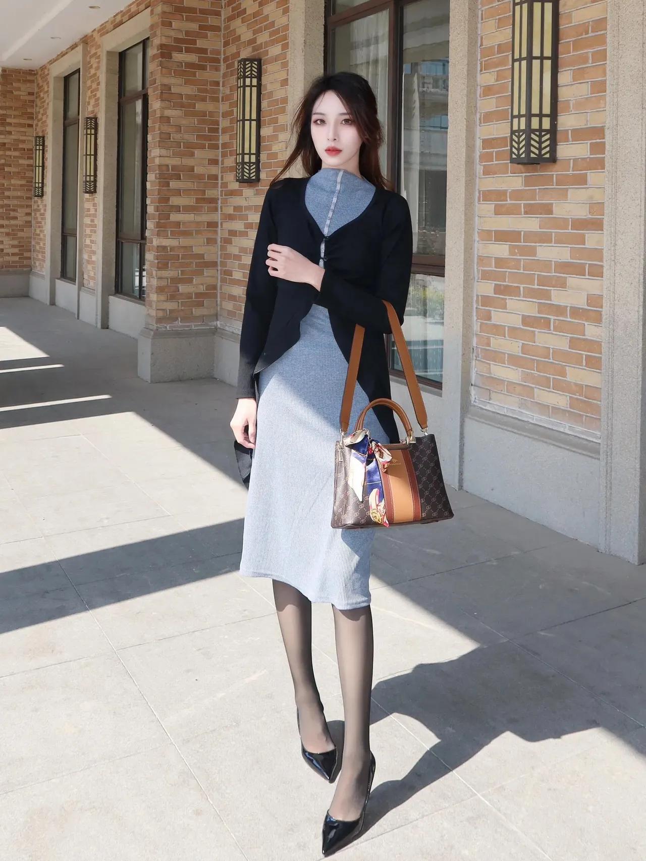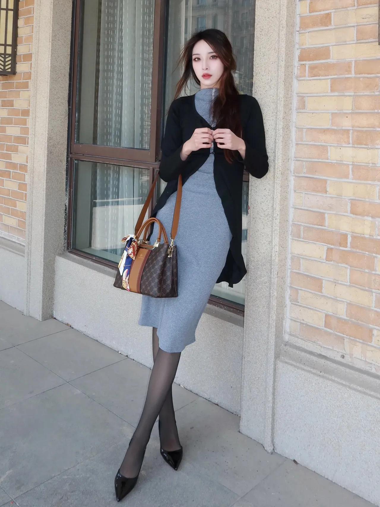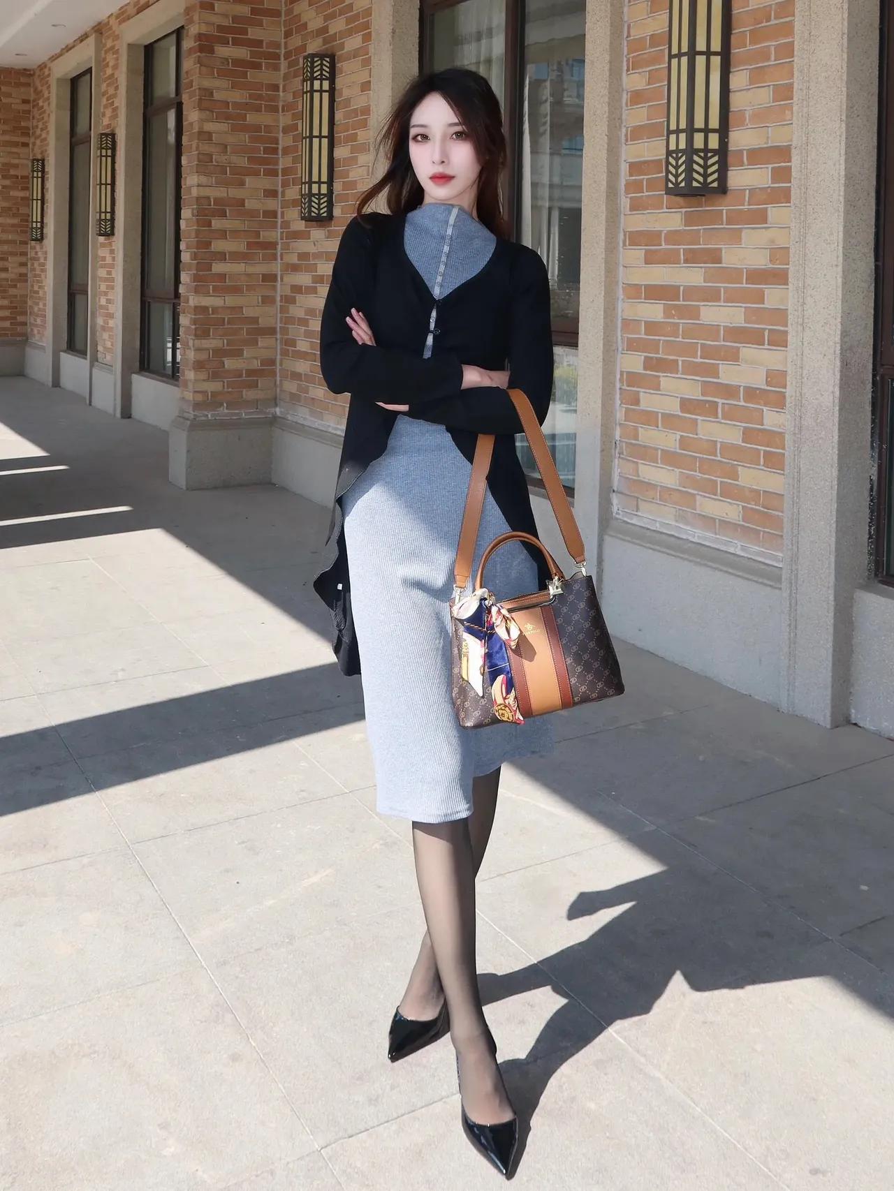 这套穿搭是优雅高级的灰黑撞色轻熟风,把温柔质感和精致细节融合得很得体。浅灰针织裙+黑色拼接开衫的搭配自带优雅氛围,针织材质柔软显质感,开衫的拼接设计增添层次;中长裙版型得体又显气质,适配轻职场通勤、都市休闲场合。 搭配尖头高跟鞋强化轻熟气场,修饰腿部线条;老花手提包+丝巾点缀提升精致度,让简约造型更显高级。能充分展现穿着者优雅高级的轻熟魅力。灰调轻熟风穿搭 灰色针织裙