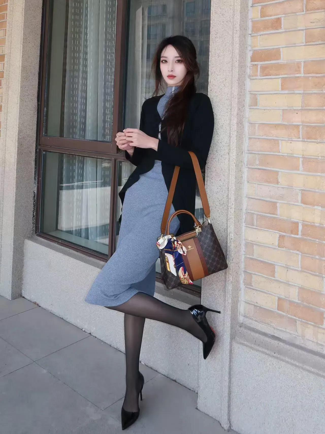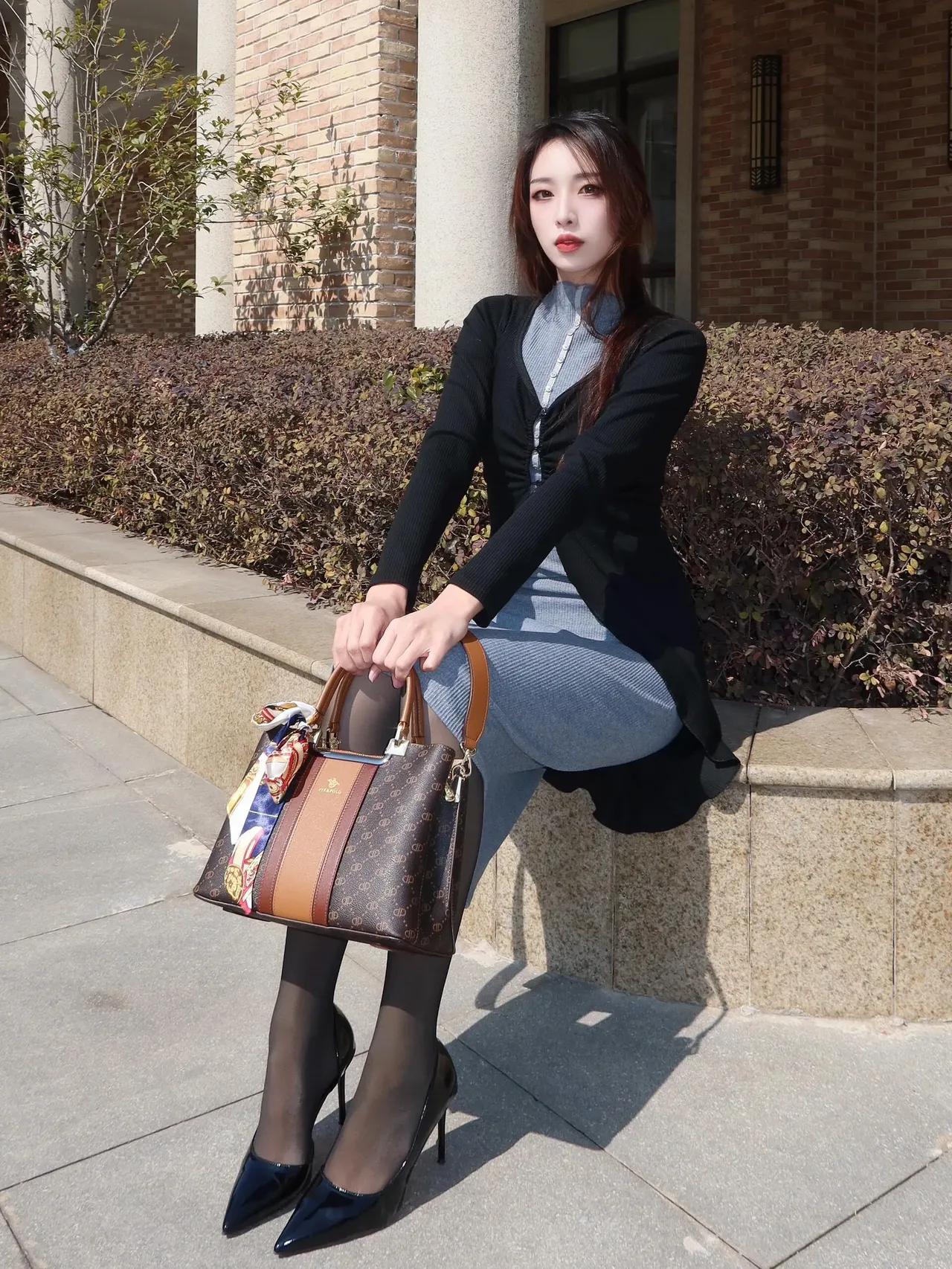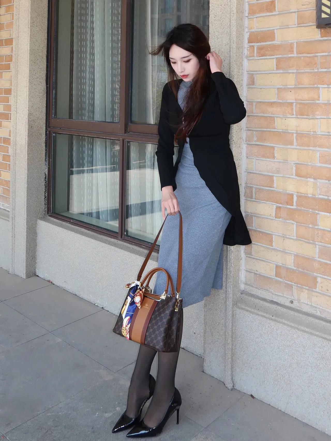 这套穿搭是优雅高级的灰黑撞色轻熟风,把温柔质感和精致细节融合得很得体。浅灰针织裙+黑色拼接开衫的搭配自带优雅氛围,针织材质柔软显质感,开衫的拼接设计增添层次;中长裙版型得体又显气质,适配轻职场通勤、都市休闲场合。 搭配尖头高跟鞋强化轻熟气场,修饰腿部线条;老花手提包+丝巾点缀提升精致度,让简约造型更显高级。能充分展现穿着者优雅高级的轻熟魅力。灰调轻熟风穿搭 灰色针织裙
