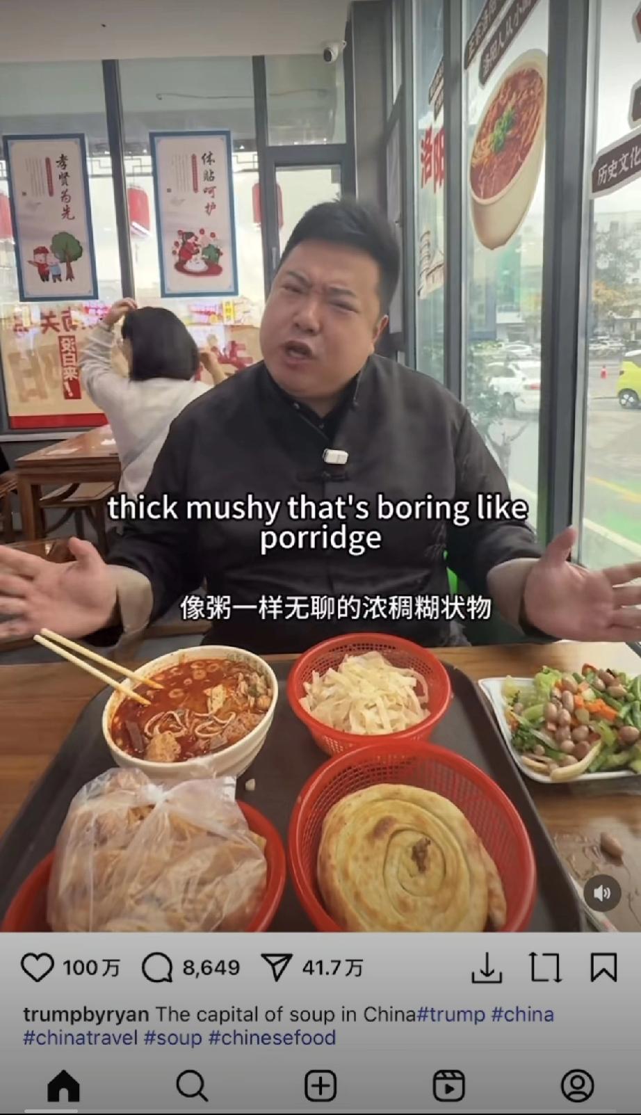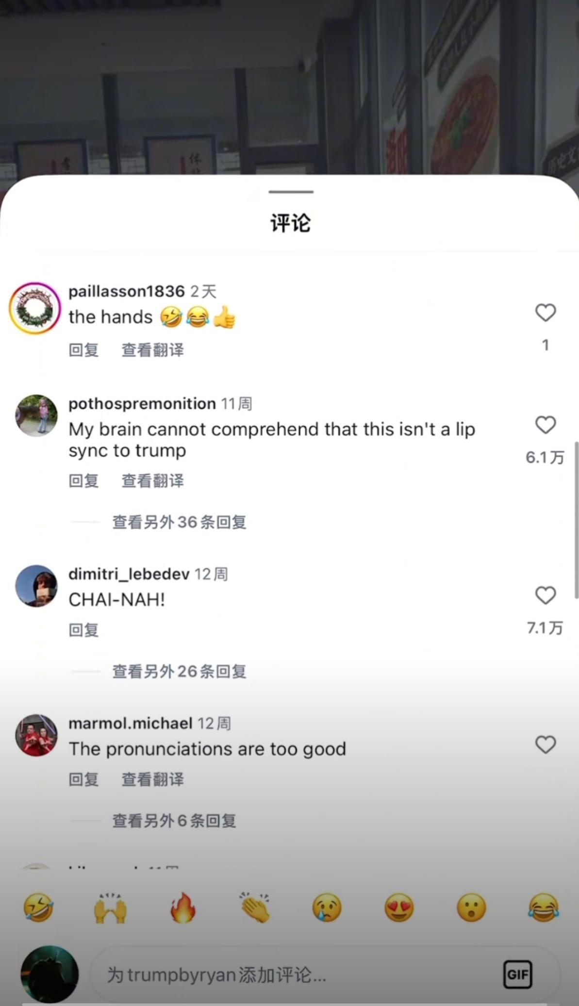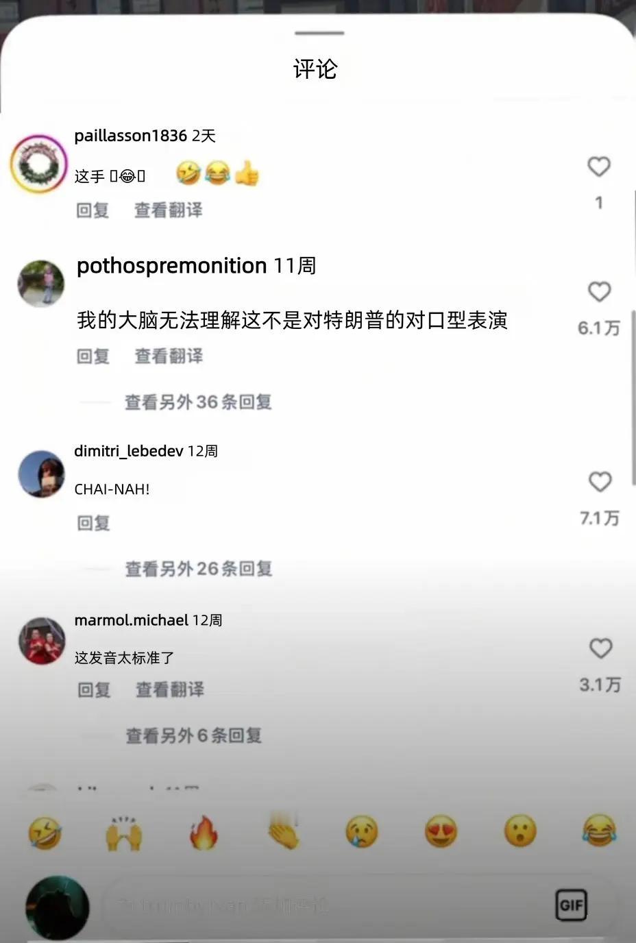 重庆川普在外网太火了,随随便便发一个吃饭视频,在外网就有100万个点赞,6000万播放量,41.7万转发量。 他的评论区,一个“我的大脑无法理解这不是特朗普的对口型表演”评论,6.1万点赞量。 一句“CHAl-NAH!”获点赞量7.1万。 一句“这发音太标准了”获点赞量3.1万。 你现在明白了吧,他为什么那么火了吧。 他已拿到美国签证,一月份要去美国,那不得刮一个“中国世界级网红”的旋风。 到时,让他表演一个握手时拉别人、捏别人手时的小动作。